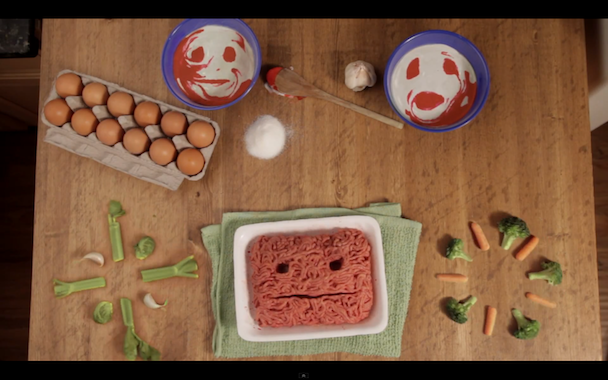 There are some great effects here, from the singing ground beef (that has to turn back to normal every time she looks at him, Toy Story style) to the broccoli and carrots, which take turns playing each other as horns and guitars, respectively. It's a very strange video. Check it out below.
