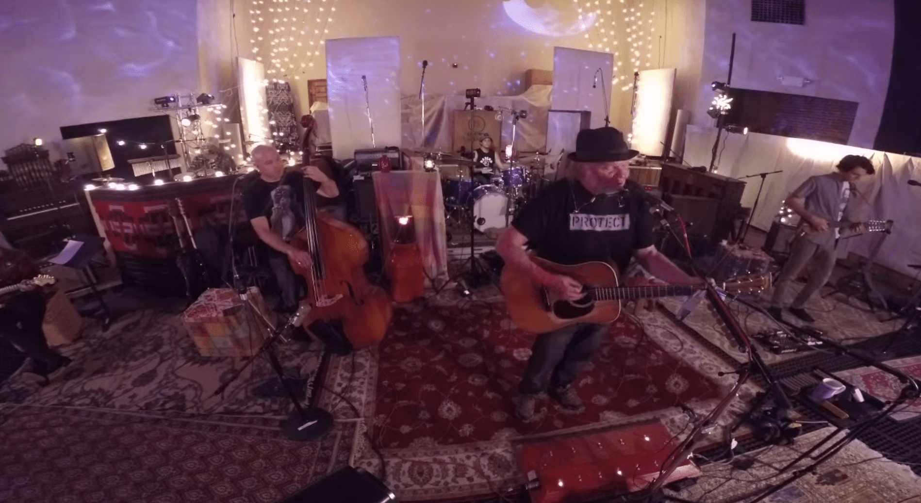 Neil Young and the band Promise Of The Real (comprising Willie Nelson's sons) will release their collaborative album, The Monsanto Years, at the end of this month, and we've already heard a live rendition of the title track and seen the video for "A Rock Star Bucks A Coffee Shop." Now, Young has debuted another new song off the album, "Wolf Moon," in the form of a video. The song's been played live multiple times before, and this visual piece is essentially just footage of Young and Promise Of The Real performing indoors with celestial projections behind them. Watch below.