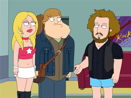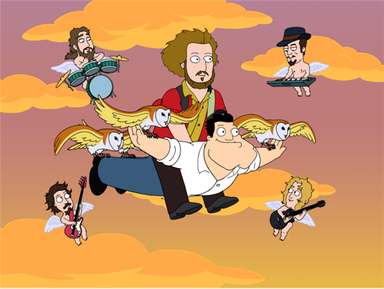 We gave the band customary consultation and they signed off on all of the artwork we ran by them.It's always tricky animating real people.Because you're not just animating them to resemble who they are in real life, you also have to make sure they resemble characters that live in the American Dad universe, and that carries with it a whole host of challenging parameters for our animators.But I think our character designers did a great job at capturing Jim and the guys.If Kiss is the semi-official Family Guy band, does that mean My Morning Jacket is the semi-official American Dad band?