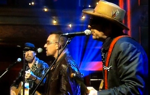 Here's Bono, taking the steam out of all the "Pump It Up" jokes everyone was making on first hearing about U2's overstuffed bag of sexy boots. This comes from last Wednesday's Season 2 premiere of Costello's excellent Spectacle With... show. As per custom, host Elvis runs an engaging Q&A segment with the band and couches it with a bunch of jam sessions in which he joins on their material ("Stuck In A Moment"), occasionally taking one over entirely with the Imposters (here, "Mysterious Ways"), and in a brand new tradition, joins the band on their song that most rips one of his. Bono and Edge also perform the song they penned for Sinatra "Two Shots Happy, One Shot Sad" with Steve Nieve and Pete Thomas, all of which we have for you here via embed.