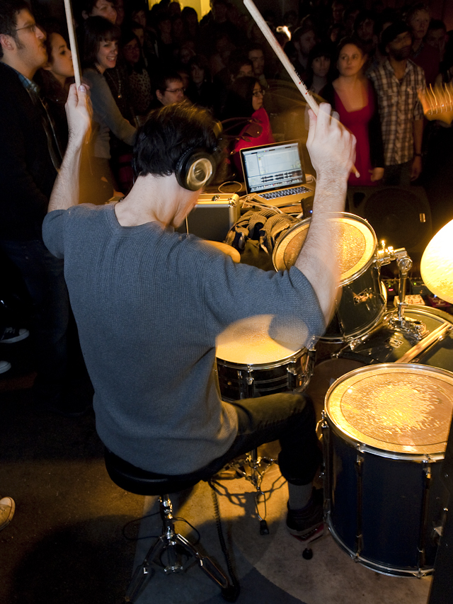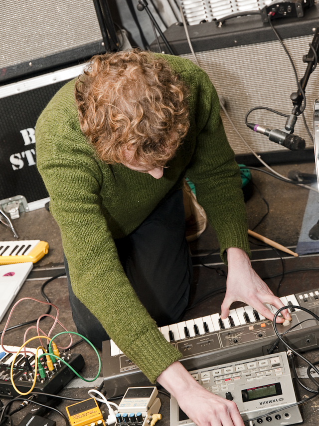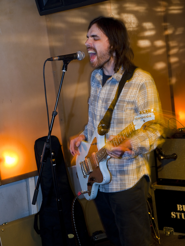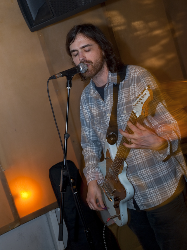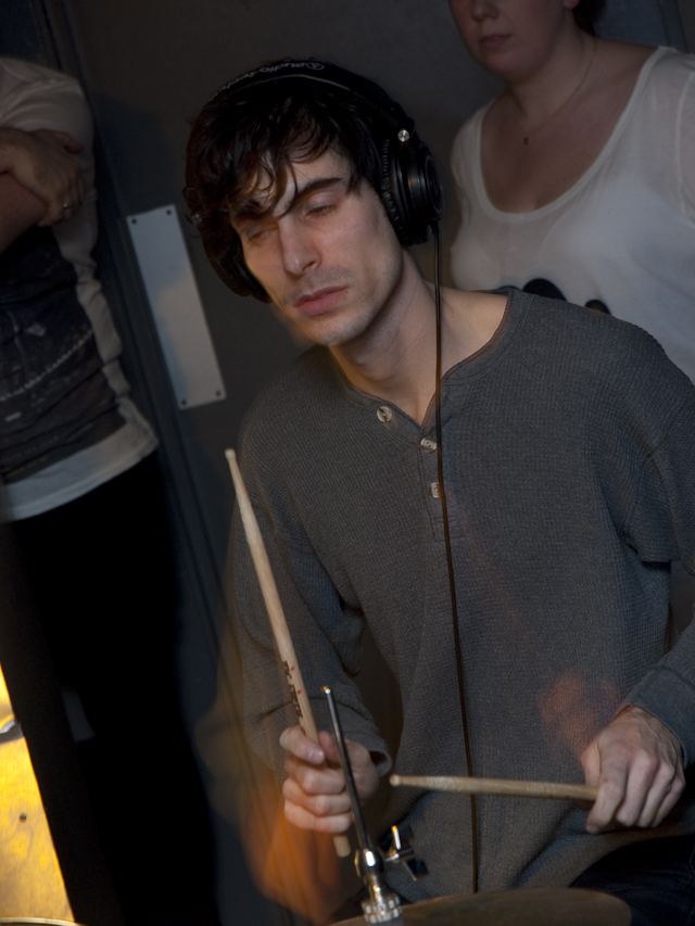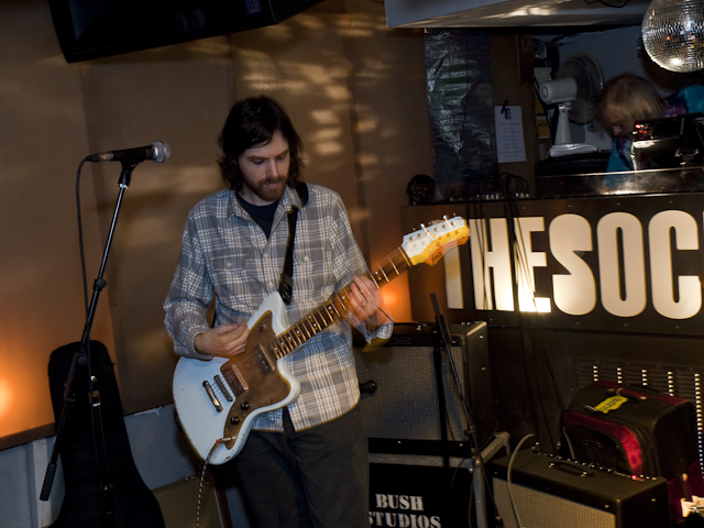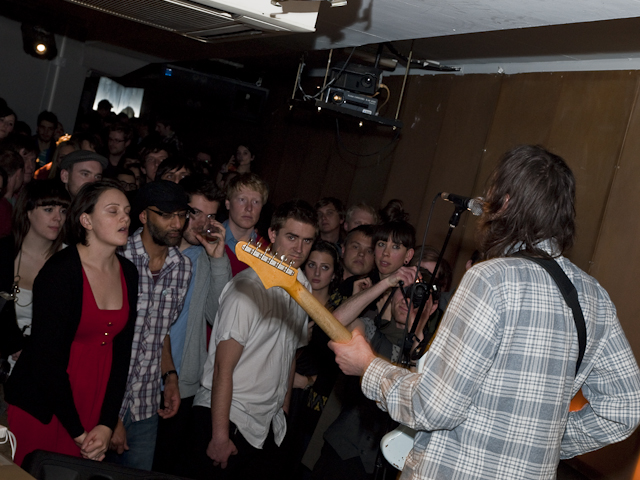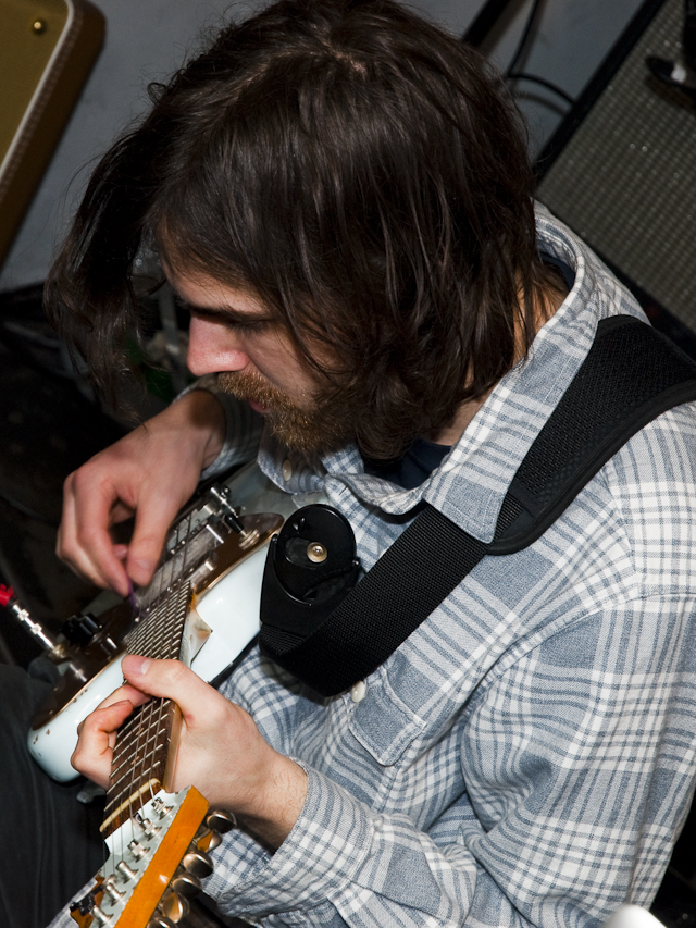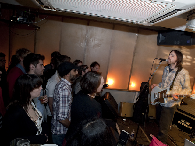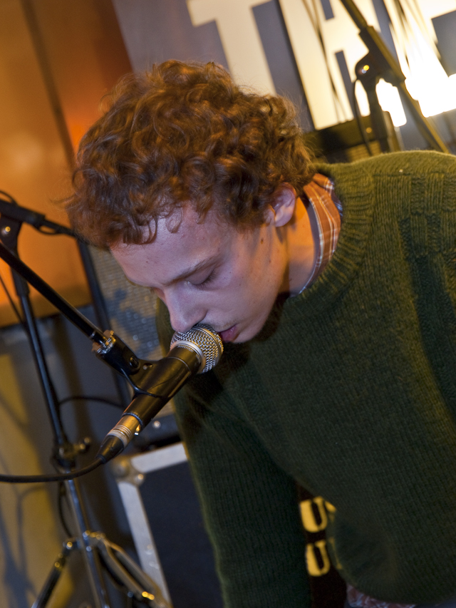 There's only so many bellwether bedroom jams you can release from a Philadelphia fortress of solitude before public appearances will be demanded, and the prolific Dayve Hawk (aka lots of names, although it's Memory Tapes for purposes of this posting) is finally making himself available to those who've been waiting patiently to seek Magic in the flesh. Saturday night at The Corner in Manchester was this project's first live show ever; last night at the Social came next. Davye was joined by a drummer, playing guitar and cueing his Macbook, at a show opened by Mat Riviere and featuring a DJ set from the Concretes' Lisa Milberg. Paul Bridgewater delivers these photos to us (a few more appear at Ill-Fit). MT have a third UK gig at North London's Luminaire tonight with Pantha Du Prince. If that's too from where you live, check the upcoming dates (listed for both sides of the Atlantic) and if your'e just getting started, try this remix or these tracks.