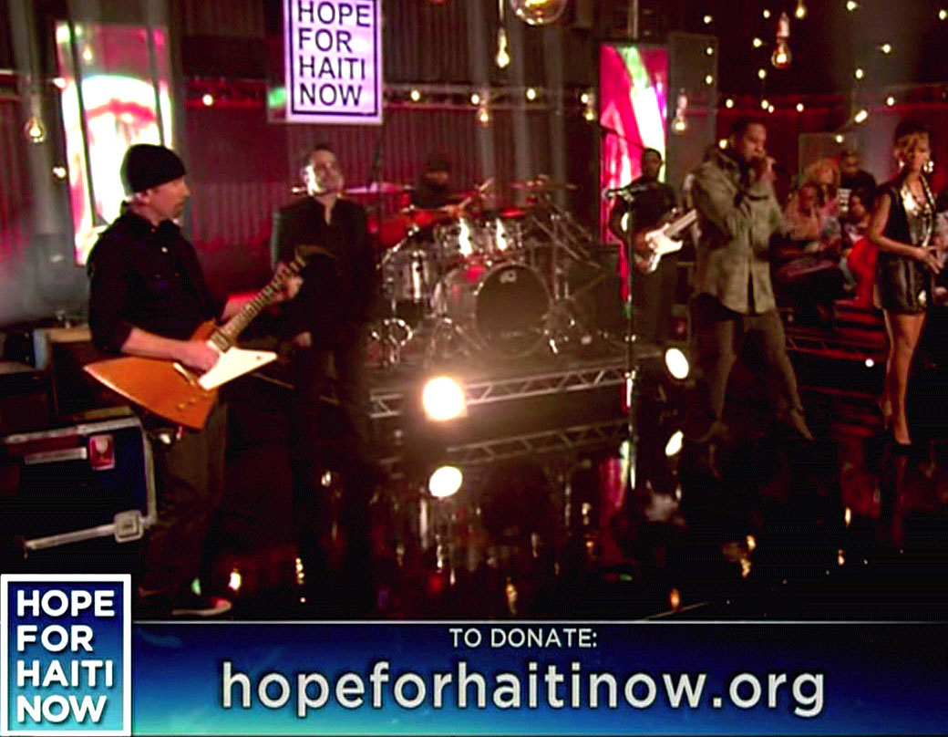 George Clooney and MTVN have organized Hope For Haiti Now: A Global Benefit For Earthquake Relief, a live telethon to be broadcast at 8 pm EST from New York, London, L.A., and Haiti, featuring Jay-Z, Bono, Madonna, Bruce Springsteen, Sting, Taylor Swift, Stevie Wonder, Justin Timberlake, Coldplay, Christina Aguilera, Dave Matthews, Alicia Keys, Wyclef, and some 100 others. Proceeds from the fundraiser directly benefit Oxfam America, Partners in Health, Red Cross, UNICEF and Wyclef's Yele Haiti Foundation. The show will be commercial free and run two hours, beginning at 8PM EST and running on every conceivable network. You can't miss it.