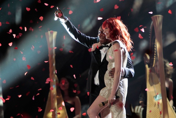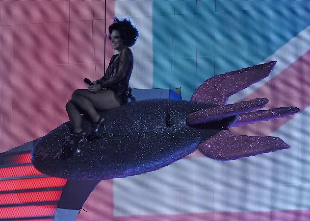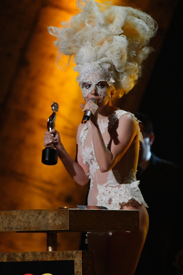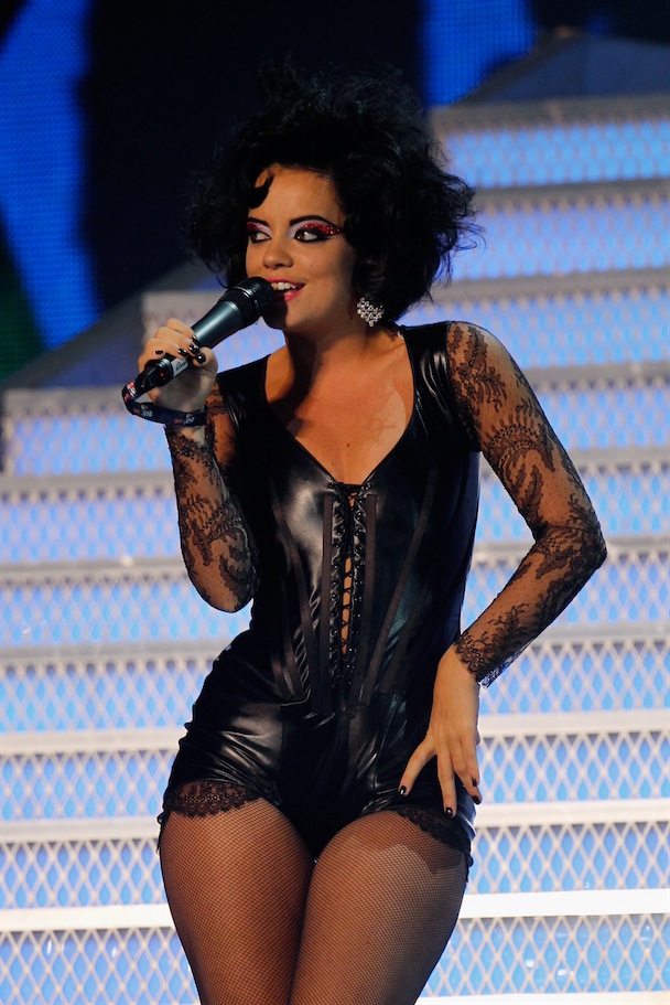 London hosted the BRIT Awards last night, which offered some nice firsts: Lily Allen won her first award as Best British Female Solo Act and her first as a Snooki lookalike (fire the stylist), and Lady Gaga swept three international awards. International Male of the year? Jay-Z. A performance highlight came via two of the night's winners, Dizzee Rascal and Florence & the Machine, performing a live mashup titled "You've Got The Dirtee Love," because Flo's "You've Got The Love" is built for this shit. Liam Gallagher also accepted an award for What's The Story (Morning Glory)? for best BRIT album of the last 30 years. It was up against albums from the Verve, Coldplay, Travis, and Keane. And Phil Collins' No Jacket Required. Robbed.