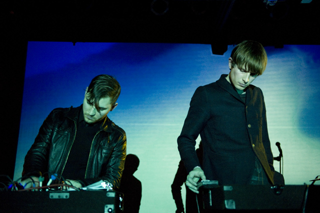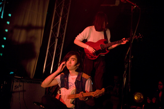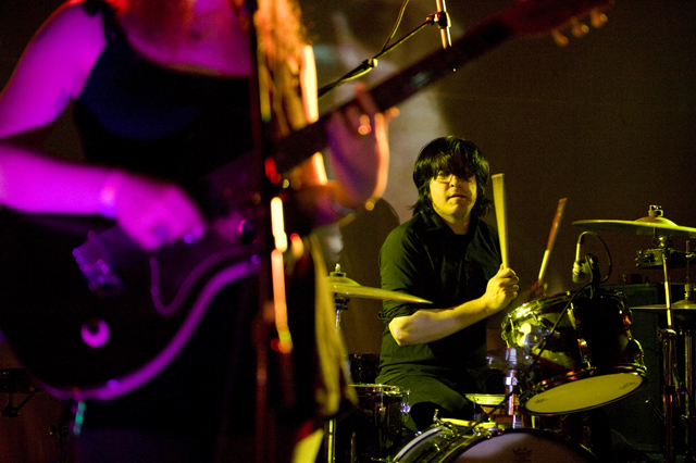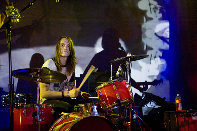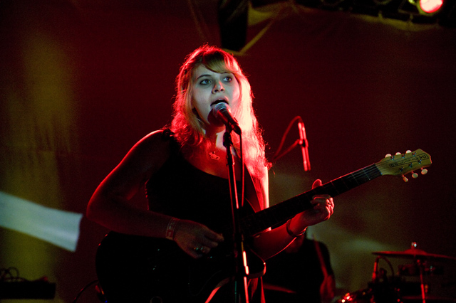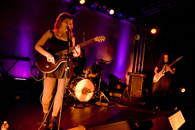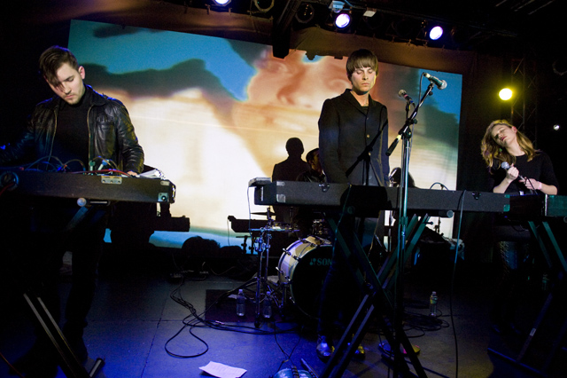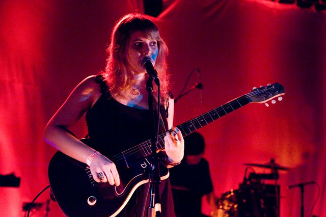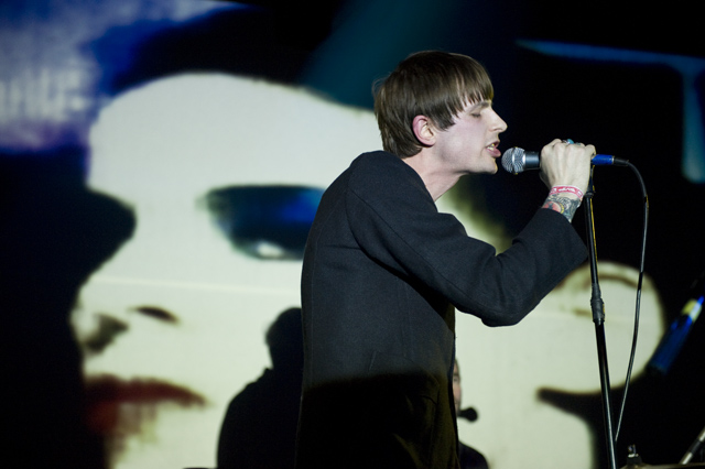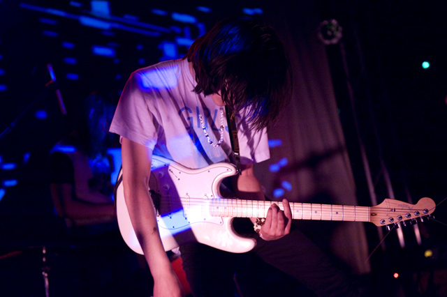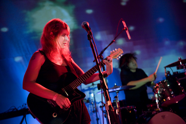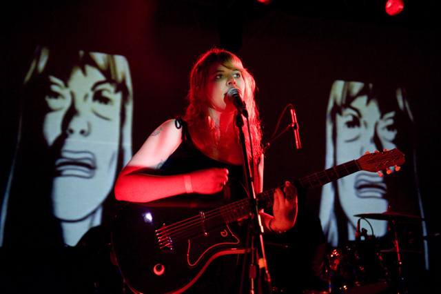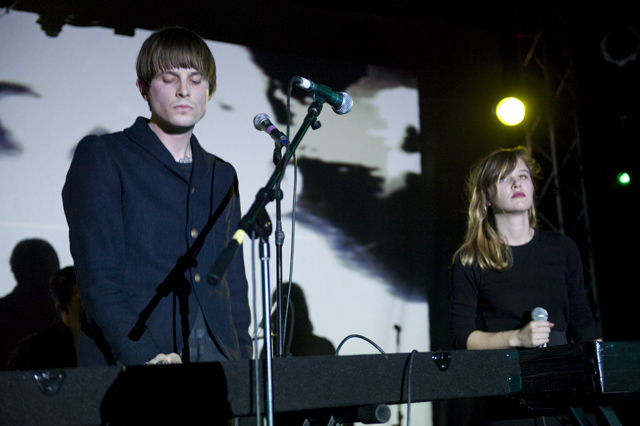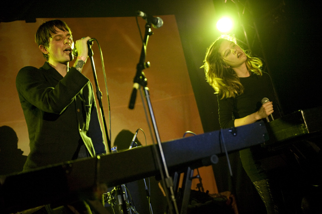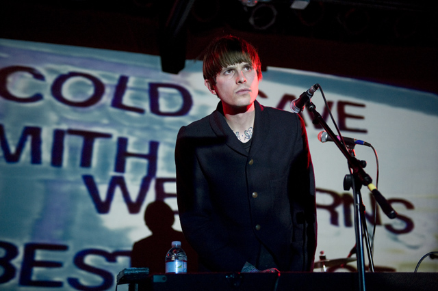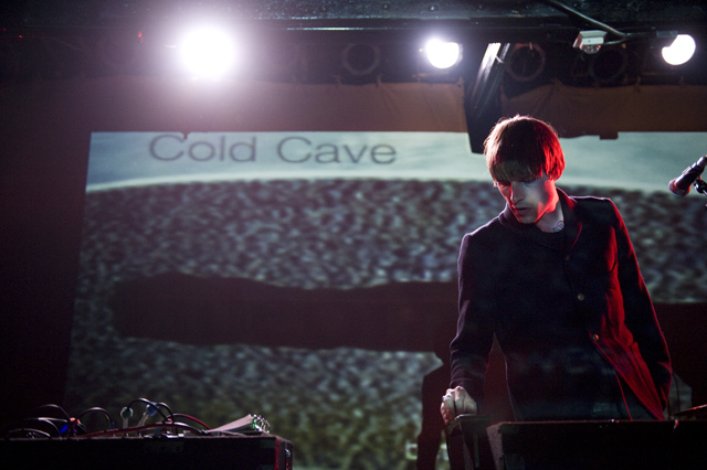 If you weren't at last night's Cold Cave set in Los Angeles, you might have to wait awhile. The darkwave synthpop project and BTW centering around Wes Eisold canceled the remainder of their US dates, resuming their tour in the UK in March. Apparently it's a lineup shakeup that's at fault: While this photo set shows that ex-Xiu Xiu lovely Caralee McElroy is M.I.A., Cold Cave was still an all-star assemblage of sorts, playing last night with the addition of ex-Mika Miko telephone operator/actress Jennifer Clavin and ex-Hercules & Love Affair guy Guy Licata, alongside reliable accomplice, noise aesthete Dominick Fernow (Prurient). No word on what version of Cold Cave will make the trip to Europe, but by this gallery I'd say Guy and Jennifer look good as vampires. Andrew Youssef delivers these shots, along with those of the openers on a stacked bill that included much loved Bethany Cosentino aka Best Coast and scraggly, glam-struck Chicago garage-pop crew Smith Westerns. Dope bill, you should be on all these bands.