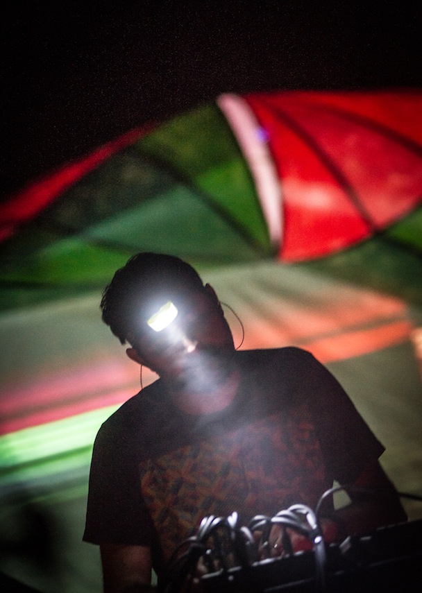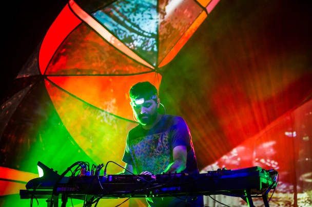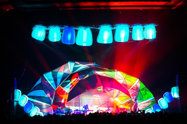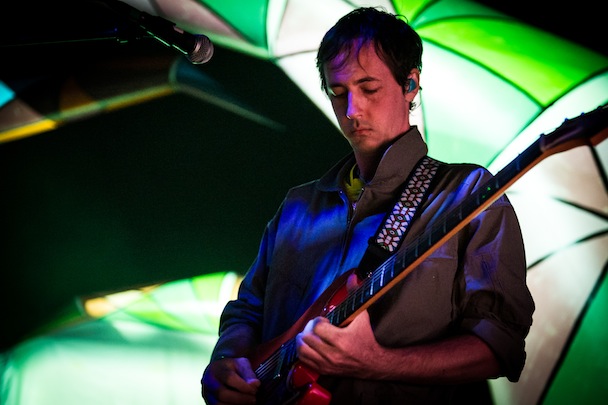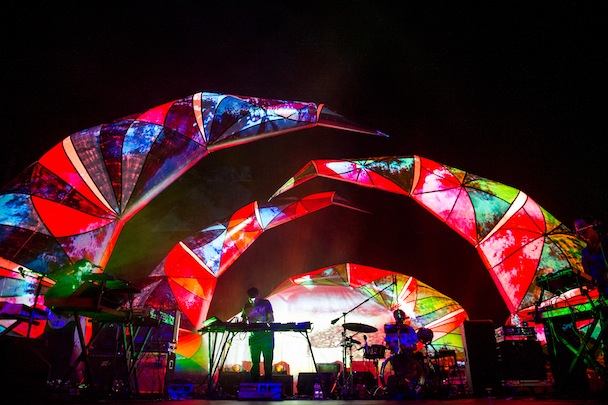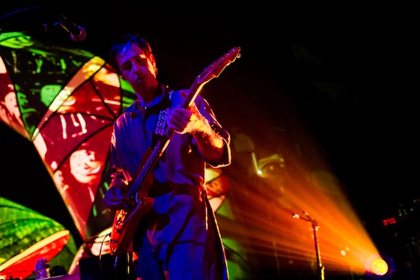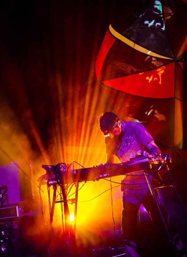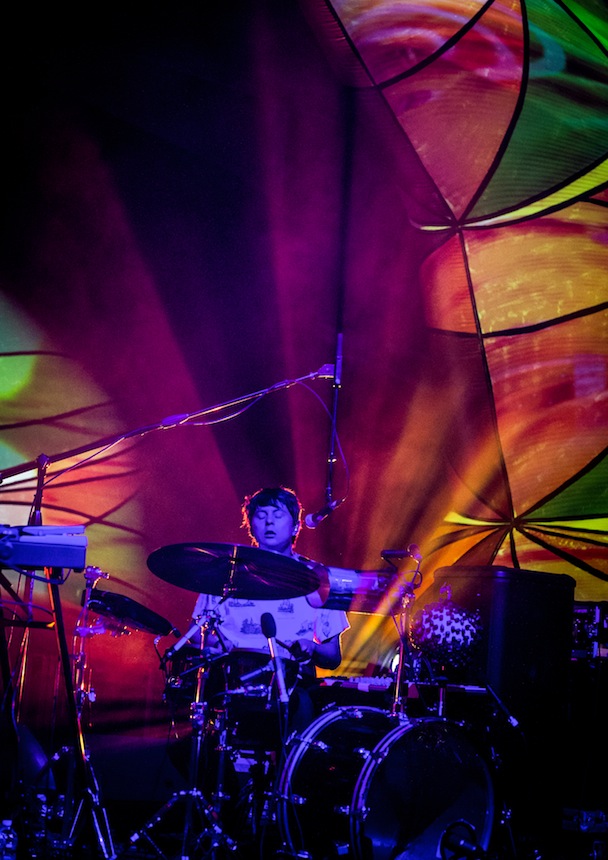 While the Baltimore Orioles were taking the Seattle Mariners into 18 innings across town, the Baltimore Animals played inside what looked like a gaping cartoon mouth. Hanging above the stage was a row of giant, couch cushion-sized teeth internally lit, matched by secondary jaws at either side of the band. Behind them arched four articulated spider legs painted in Navajo-print abstract, a monstrous throat that swallowed the band whole. At the back of the stage, with a headlamp strapped to his dome (tradition!), Geologist, aka Brian Weitz, futzed with a tableful of digital boxes. Next to him Panda Bear, aka Noah Lennox, played a drum kit that sounded like everything but drums.