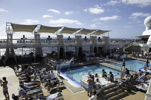 Day 1: A glass of champagne and Ned's Atomic Dustbin's "Grey Cell Green" greeted me moments within boarding the Celebrity Silhouette for S.S. Coachella's maiden voyage to the Jamaica. Could Coachella harness years of magical moments and transfer them onto a boat? It only took me a few moments to firmly believe this would be a special trip as I was seated between Dylan and Joe of Cloud Nothings during the mandatory boat safety seminar. Even elevator rides were unique as members of Hot Chip and Pulp would cooly step inside with you. Sending us off in style was an unannounced DJ set by James Murphy of LCD Soundsystem on the main deck as the splashing of waves mimicked the pouring of alcohol. Our senses were bombarded as Cloud Nothings rocked with abandon, unleashing their regimented punk fury in the tiny Sky Lounge. Everyone swayed along whether they liked it or not -- but it's a lot easier to move to the music when you are on a boat. The highlight of the evening was Pulp. My head was spinning during "This Is Hardcore" as Jarvis Cocker gave everyone a strip tease, taking off his jacket and necktie. Was I really seeing Pulp in the middle of the ocean with a few hundred people? Even Cocker couldn't help point out the absurdity of singing "Common People" on a luxury cruise liner. Closing out the night with "Mis-Shapes," Cocker got into the holiday spirit, momentarily donning a Santa cap. The night only got foggier with the head-spinning beats of El-P and the percolating synthesizer attack of Simian Mobile Disco who emerged from a hole in the stage for one of the best entrances of the evening. How will I survive the next couple of days with a bunch of shipsters?