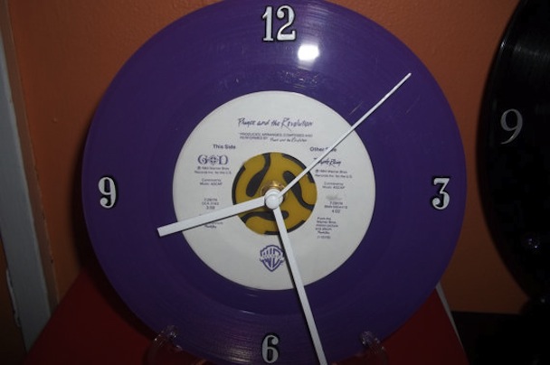 Does his Purple Majesty, as has occasionally been rumored, actually possess total control over the time-space continuum? How else to explain his uncanny capacity to wed music's latest trends to the history of rock & roll and soul music with such shrugging ease? It's probably just because he is a once-in-a-lifetime genius, but maybe this special-edition clock fashioned from the original Purple Rain 7" single can lend a little insight into this issue as well. Does it even … you know, tell the time? Not like Morris Day, but actually the hour of the day? Does it even matter? Nobody could ever argue that this would not serve as a constant reminder of the important things in life: love, spirituality, and a special emphasis on a certain kind of satisfaction. As the seller indicates: This item can be hung. Yeah, you better believe it.