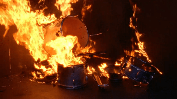 Sometimes a good music video does just one thing really, really well. That's the case with the Eric Wren-directed video for Survival's "Tragedy Of The Mind." Survival are the new and old band of Liturgy frontman Hunter Hunt-Hendrix, and it's hard not to get excited for their debut album with every new song we've heard. The video for "Tragedy" is so simple (a single unmoving shot) yet its execution is as powerful as the music. Starting with a flaming mic cable, the band's instruments are thrown one by one into a growing fire while occasional streams of gas help it grow; nothing else happens, and nothing else needs to happen. Survival are a much more psychedelic band than Liturgy, and here they are perfectly complemented by these hypnotic flames. Guitars are smashed and burned; drumheads melt and peel apart. In a moment of (seemingly) natural chance a floor tom falls in a way so that we can see smoke building up and collecting inside -- until the flames explode and shoot through like a fucking cannon. It's a video that perfectly captures this band at this moment. Watch.