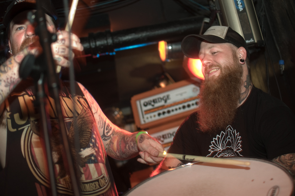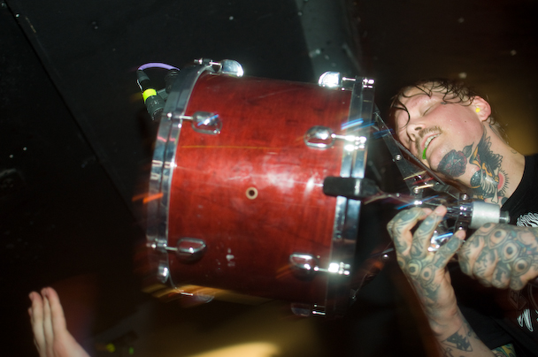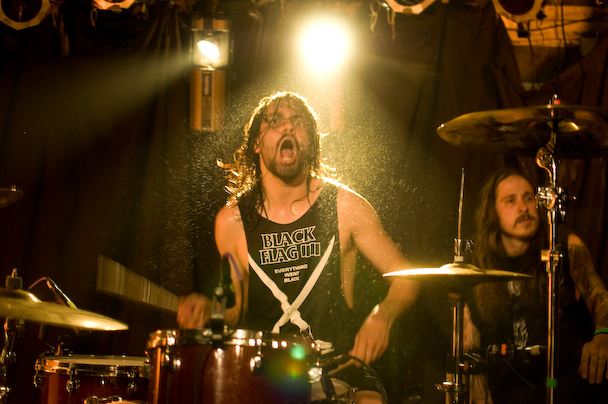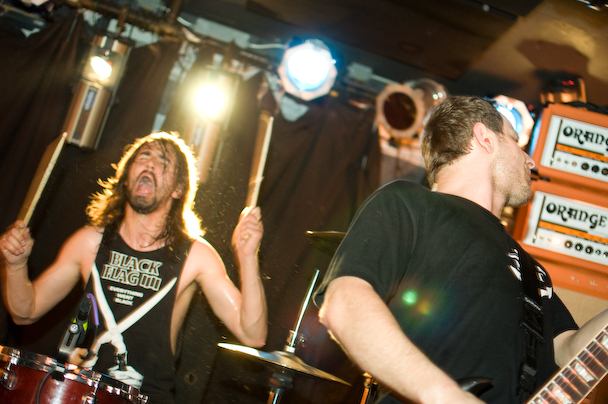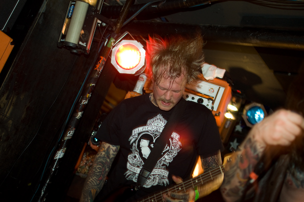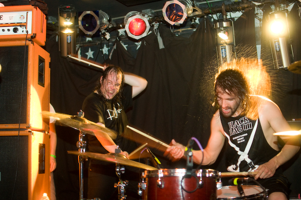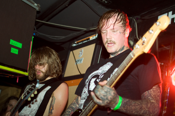 The band ripped through an insanely energetic set that included "Mjød," "Bruane Brenn," "Sjøhyenar (Havets herrer)," "Evig Vandrar," "Nekroskop," "Ulvetid" and more that I would remember if I hadn't been too busy fighting to stay vertical. They had a penchant for climbing and used the lighting rig above the crowd like a set of monkey bars—bassist Marvin Nygaard started the trend, showing off a pretty sweet "TOO DUMB FOR NEW YORK TOO UGLY FOR LA" shirt in the process. He returned to the lighting rig, bass guitar and everything, for a second go later in the show before crowdsurfing over to the bar about forty feet away where he continued to play. One of the guitarists, inspired by his move, followed soon after. I caught a knee to the nose when another guitarist, Bjarte Lund Rolland, jumped for his go on the lighting rig—not complaining, just trying to give a feel for what it was like. After an encore that included "Kvelertak," and "Utrydd Dei Svake" the band was joined by some of the guys from Black Tusk on stage. Some instrument swapping ensued, and Weinberg handed out drumsticks to the crowd and the Black Tusk guys and Nygaard held up drums for the crowd to bang. A girl got on stage and was handed a guitar that she strummed. The whole thing devolved into a big, fun mess, and Rolland ended the show by handing out small Norwegian flags.