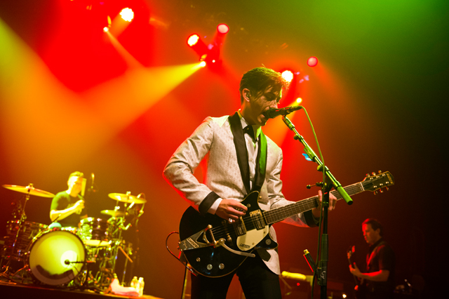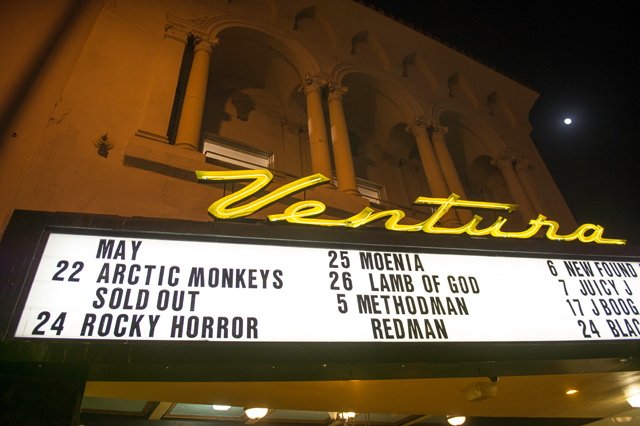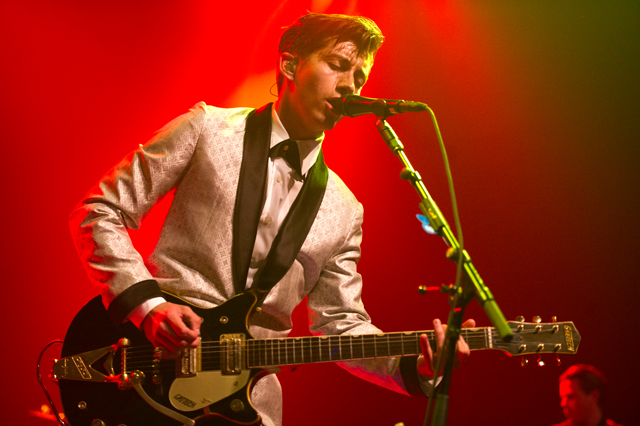 An enthusiastic 1,200 folks danced at the sold-out Majestic Ventura Theater, soaking up a twenty-one song set by Arctic Monkeys who are doing a handful of dates across the States before their headlining slot at Glastonbury. They kicked off the show with a new song "Do I Wanna Know?" (watch below) before digging up older gems like "Fake Tales Of San Francisco" and "Dancing Shoes." Check out the photo gallery above and the setlist below.