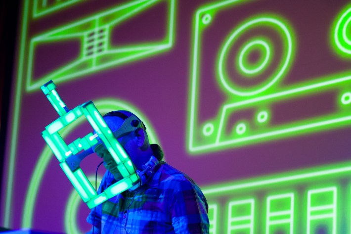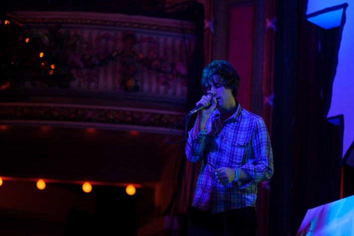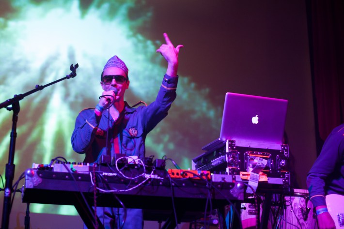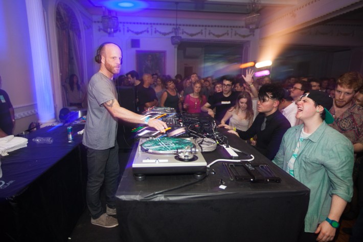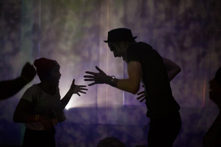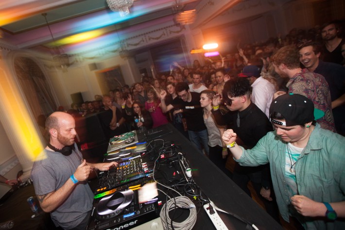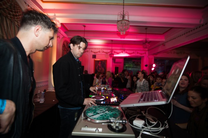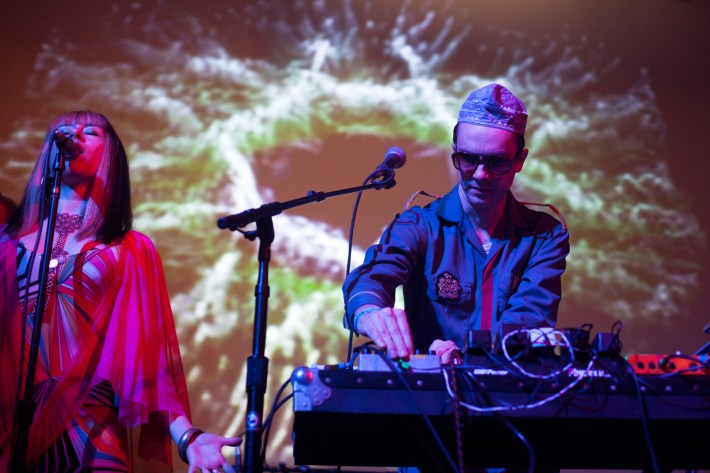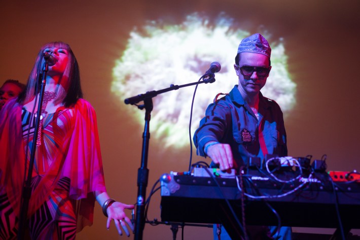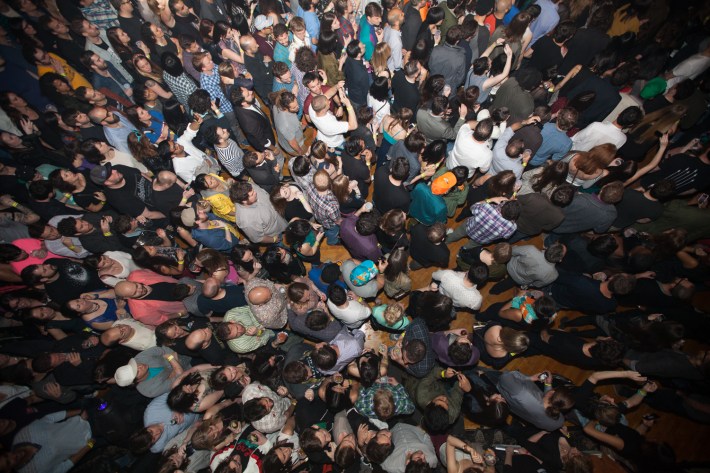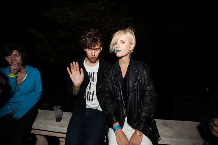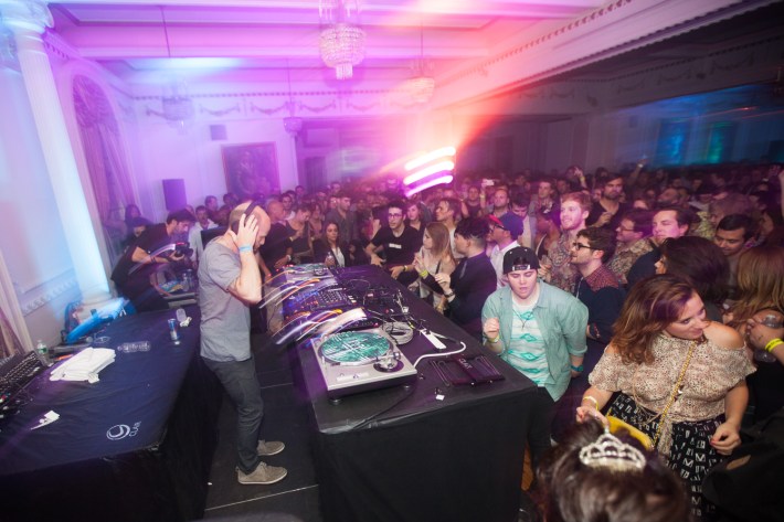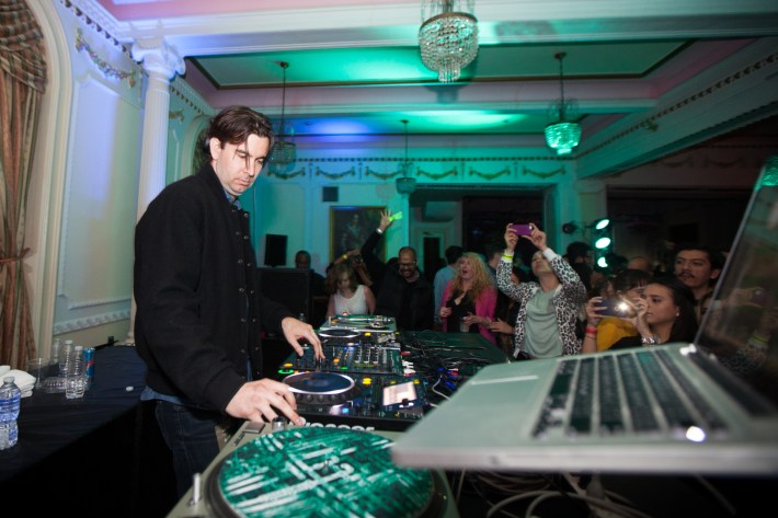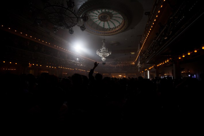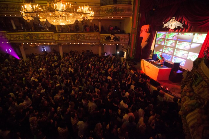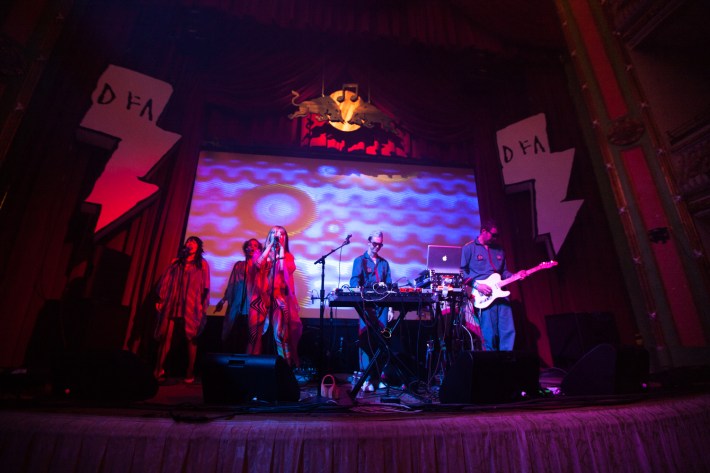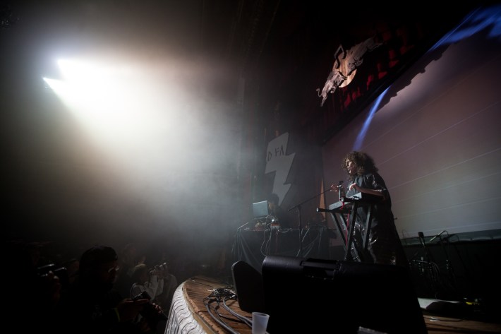 On Saturday, Brooklyn's gorgeous Grand Prospectus Hall hosted an anniversary party for the new millennial cool factory that is DFA. The label tweeted that they were expecting around 4,000 people, and if you factor in the lack of weekend L train service, the formal attire, and the pent-up enthusiasm of that considerable number of ticket-holders who were compensating for having missed out on LCD's final bow at MSG, the event was aswirl with vibes. And molly. The Hall itself is a dazzling space, with multiple rooms dedicated to live sets from the likes of Black Dice and YACHT and Planningtorock, and DJ sets from the Rapture and LCD crew Nancy Whang and Pat Mahoney and, of course, a culminating one from prom king in residence James Murphy, who tucked himself onto a dark corner of the balcony for a DJ set that concluded, poetically, with the Talking Heads' "This Must Be The Place." We sent photographer Daniel Topete to capture the sights, and he came back with a really beautiful photo set. Scroll through above, Death From Above.