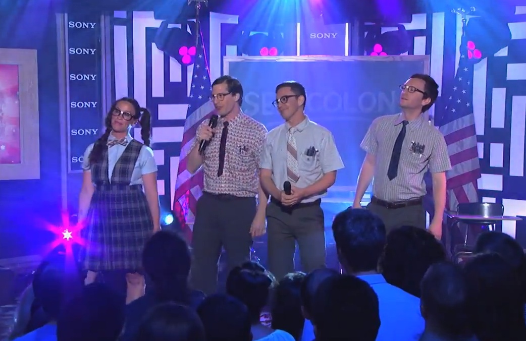 The Lonely Island started as a video thing, and they've almost never taken their act to a stage -- any stage. Last night, however, they were musical guests on Jimmy Kimmel Live, where they performed the hashtag-rap grammar-nerd anthem "Semicolon." Solange, who sings on the song's recorded version wasn't there. Instead, Alanis Morissette, of all people filled in, and found some room to riff on her own history with tortured definitions during the performance. This was generally all pretty great, and you can watch it below.