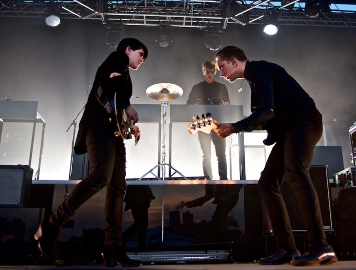 Haim and Freddie Gibbs kicked things off on Sunday, while festival circuit-mainstays like Yeasayer, Gary Clark Jr., and the xx played throughout the rest of the afternoon. Grizzly Bear, who are also of this ilk, were an excellent pre-Kanye presence on the main stage. The sun set behind them, as if all their vocal harmonies will lulling it down from the sky. Later, on a smaller stage, Bloc Party almost resurrected the mid-2000s. They're the kind of band that demands attention and had a crowd that seeped out of the small tent they were performing in throughout the muddy trenches of the field and played Silent Alarm hits, material from their last album Four, and a cover of Rihanna's "We Found Love" as if the somber xx weren't just a slingshot away and they were the only band left to see that night. But while this year's Gov Ball was heavy with many beloved bands old and new and came with an unexpected narrative via Tropical Storm Andrea, the most-anticipated story of the weekend was Kanye West's performance.
