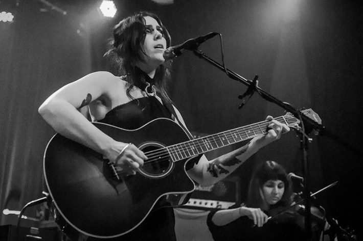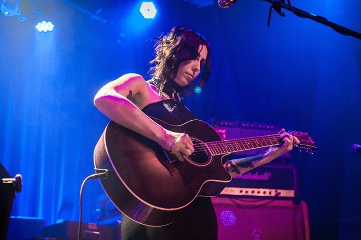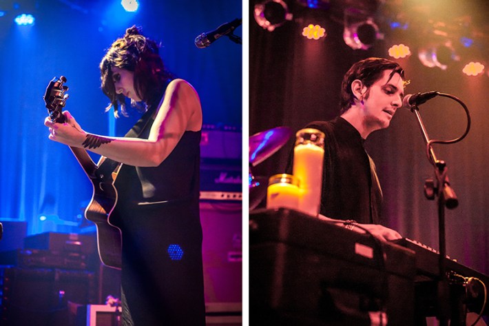 This was poor luck for Chelsea Wolfe, who opened the show. Stereogum has called her folk songs "murky," "lo-fi," "gothed-out," and "dark-pop," which pretty much sums up her performance as well. The live version of her work mirrors the stillness and minimalism of the recorded version: she engaged in little onstage movement, but used enough PA reverb to justify your soggy metaphor of choice. (Bathed in reverb? Soaked in reverb? Drenched in reverb?)