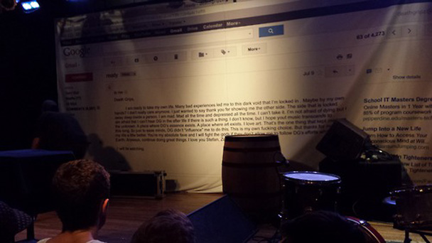 Death Grips have bailed on Lollapalooza 2013. Last night, the band never showed up to the official aftershow they were set to play at Chicago's Bottom Lounge. When the band never played, fans apparently destroyed all of Death Grips' equipment, according to what a bunch of folks have posted on Reddit and Twitter. Amongst the various objects destroyed was a drum kit that probably belonged to Zach Hill. Also according to Reddit, while the venue was waiting for the band to arrive, they displayed a screenshot of a Gmail message of a suicide note that may have been from a Death Grips fan. A transcription of the letter via Reddit is below.