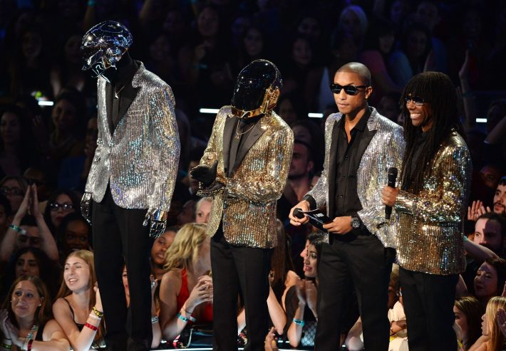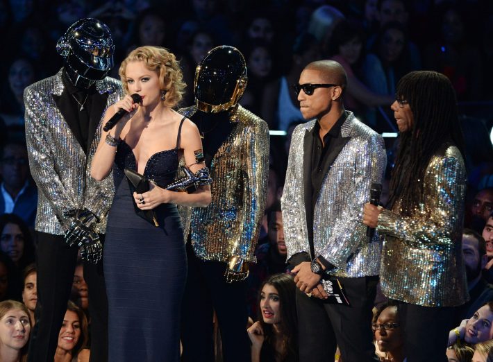 As Stephen Colbert promised earlier this month, Daft Punk made a rare public appearance at tonight's MTV Video Music Awards. The robots posed for photos on the red carpet outside Brooklyn's Barclays Center, and took the stage with Pharrell and Nile Rodgers to present the award for Best Female Video to Taylor Swift. Also, a minute of the rumored "Lose Yourself To Dance" video premiered during a commercial break. A full-length video for "Get Lucky" never materialized, so it's unclear if this is a preview or this clip is all we'll get. Watch it, and the video of Taylor getting her award, below.