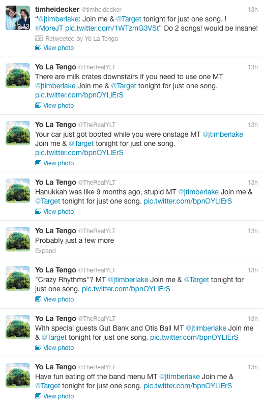 And in other Timberlake news, NJ.com reports that Timberlake spent last night at the legendary and recently-shuttered Hoboken indie club Maxwell's, where he filmed a commercial for Target. Thousands of fans clogged the streets outside Maxwell's, and 150 got into the taping. This seems like a pretty lame way for Maxwell's to go out, especially after all the closing-ceremony stuff, but this is the way of the world now. Read some amusing tweets about the event from Maxwell's de facto house band Yo La Tengo below.