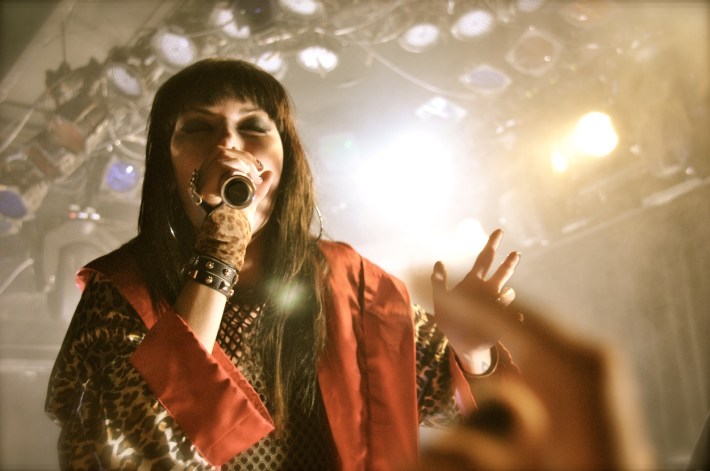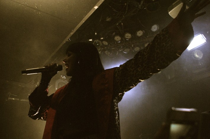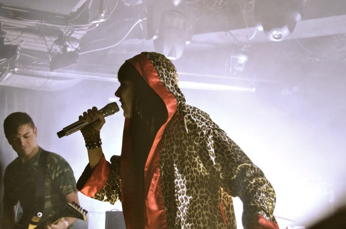 Four years ago, before releasing any full-length material, Sleigh Bells played a show at (Le) Poisson Rouge that caught our attention. Last night, the Brooklyn-based duo celebrated the release of its third full-length album Bitter Rivals in the same filled-to-capacity venue. Derek Miller and band walked onstage to an electronic drumroll produced by a guy who remained shrouded in shadow for the rest of the show. But Alexis Krauss, the vocalist and front woman of what was originally Miller's project, doesn't look like she actually walks anywhere. She stormed the stage in the leopard-print boxing robe she wears in the "Bitter Rivals" music video and launched into the cheer-team worthy track "Minnie."