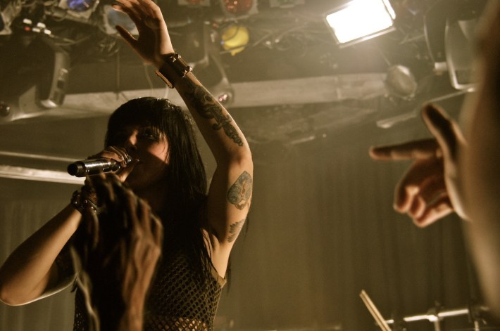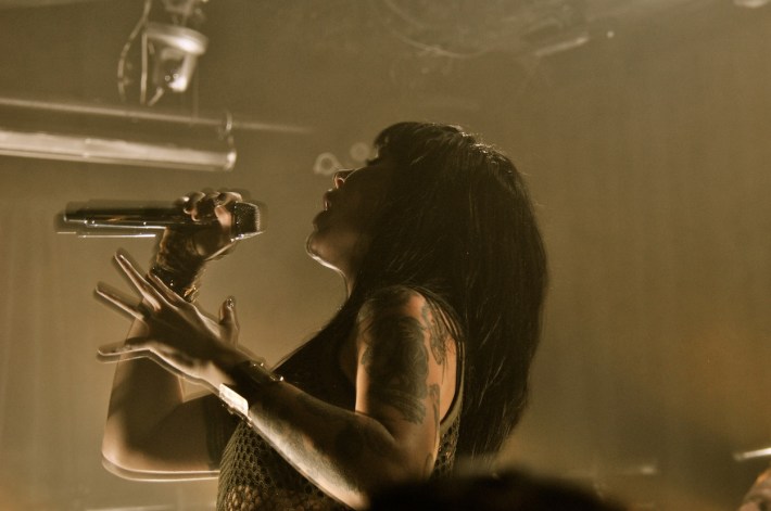 Even during the quieter moments of Sleigh Bells' set, of which there were few, the crowd of mega-fans had an almost-menacing full-frontal enthusiasm that made the opening roar of every song a moment of high-anxiety. I saw one guy play air guitar and there were a few crowd-surfing attempts, one of which ended with a girl getting knocked to the floor while her boyfriend bristled in silent rage. It became difficult to distinguish whether or not the crowd was feeding Krauss, or vice versa. During "Born To Lose," she fell back into the audience and sprayed a bottle of water across the first three rows of people. At the end of the encore, she allowed fans to charge on stage with her as the kick-drum sputtered out in the closing moments of "A/B Machines."