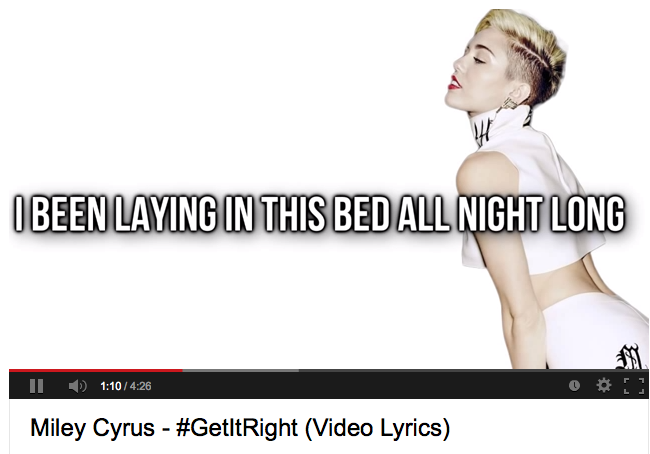 Dear Miley. I can't stop listening to #GetItRight (great song, great message, great body), but maybe you need a quick grammar lesson. One particular line causes concern: "I been laying in this bed all night long." Miley, technically speaking, you've been LYING, not LAYING, an irregular verb form that should only be used when there's an object, i.e. "I been laying my tired booty on this bed all night long." Whatever. I'm not the best lyricist, but you know what I mean. #Get It Right The Next Time. But don’t worry, even Faulkner messed it up. We all make mistakes, and surely this isn't your worst misdemeanor. But also, Miley, did you know the tense here is also totally wrong. Surely you've heard of Present Perfect Continuous Tense (I HAVE BEEN LYING in this bed all night long [hopefully getting some beauty sleep?]). It's a weird, equivocal, almost purgatorial tense, not quite present, not quite past, not quite here, not quite there. Somewhere in between. I feel that way all the time. It kind of sucks. But I have a feeling your "present perfect continuous" involves a lot more excitement than mine. Anyway, doesn’t that also sum up your career right now? Present. Perfect. Continuous. And Tense. Intense? Girl, you work it like Mike Tyson. Miley, I love you because you’re the Queen, grammatically and anatomically speaking. And you're the hottest cake in the pan. Don’t ever grow old. Live brightly before your fire fades into total darkness. XXOO Sufjan