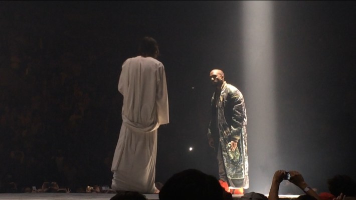 "Through The Wire" and "Jesus Walks" tripped back into Kanye's catalog, the latter introducing the climax of the performance. After 90-some minutes of anonymity, Kanye stripped off the mask and came face-to-face with the object of his quest: "White Jesus!" he said to the robed, White Jesus-looking dude who strode beatifically onto the stage. "Holy shit! I've been looking for you my whole life! And fuck, I just said 'shit' in front of Jesus!"