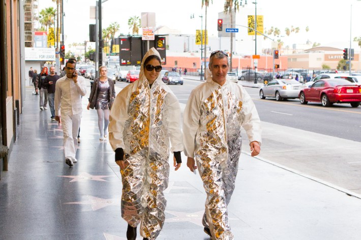 And everything still seemed promising upon arrival, with a heavy media presence meaning lots of familiar faces, and a significant participation on the band's request that attendees dress in the "Be A Reflektor" theme. But the stage wasn't on top of the Capitol Records Building, or it was, but now how anyone would think. Rather than have people on the iconic tower circular tower, the band was to play of the much shorter base of the building, about three stories above a parking lot where the fans started gathering in mass. Rather than an intimate performance, we were watching Arcade Fire with thousands of others. Add in the people viewing remotely on the internet, the "we" was surely a huge number.