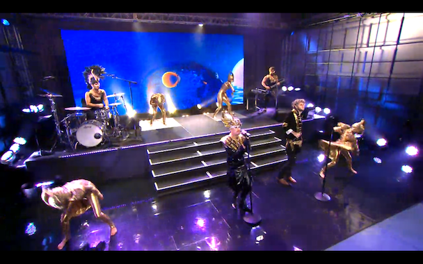 Empire Of The Sun have made a name for themselves with their absurdly theatrical live shows. They brought that huge performance by The Tonight Show on Friday, and you can stream it now. You'll have to click through to the last section of the video (and sit through a couple ads) which is roughly 36:30. As you can see above, they have a pretty elaborate set-up as they perform the track "Alive" from their recent album Ice On The Dune. Watch the video below and check out our Turntable Interview with Nick Littlemore, one half of the duo.