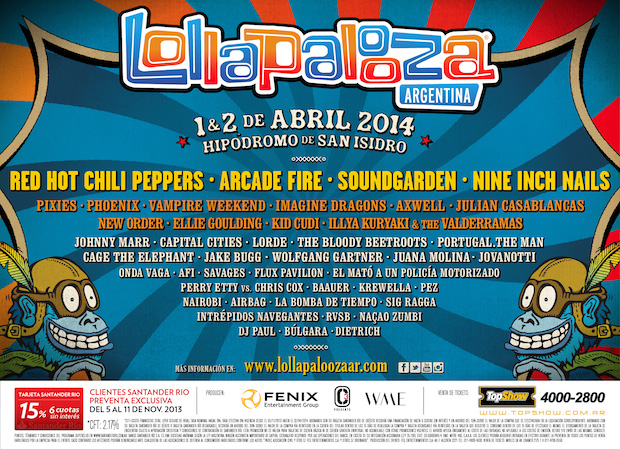 Lollapalooza Chile goes down next 3/29-30 at Santiago's O'Higgins Park, and Lollapalooza Argentina comes to Hipodromo de San Isidro in Buenos Aries 4/1-2. Both lineups have tons of artists from their respective countries, but the two lineups of international performers are more or less identical. Both fests will feature some serious heavy hitters: Arcade Fire, Nine Inch Nails, Soundgarden, Red Hot Chili Peppers, Vampire Weekend, Phoenix, Pixies, New Order, Julian Casablancas, Lorde, Johnny Marr, Ellie Goulding, Kid Cudi, Savages, Flume, Baauer, AFI, and a tone of others.