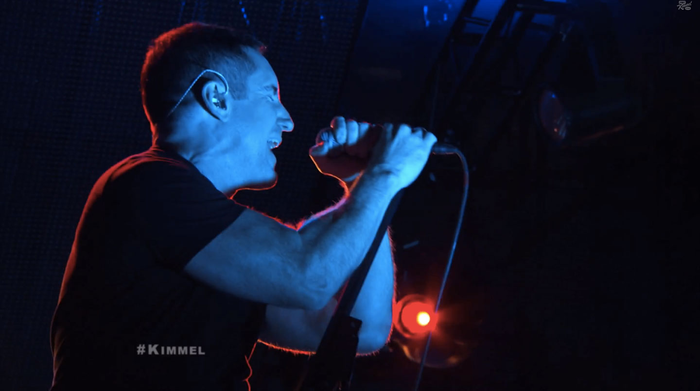 Televised Nine Inch Nails performances have historically been rare things. There was Dance Party USA in 1989, the VMAs in 1999, and that's pretty much it. Somehow, Trent Reznor has made it more than two decades into a career without ever performing on late-night TV, which is mind-boggling. That changed last night. Reznor and his band played in the big outdoor stage at Jimmy Kimmel Live!, playing five songs including a sinewy, strutting, six-and-a-half minute take on the surprisingly funky Hesitation Marks album track "All Time Low." The performance showcases a band completely in control of its own groove (those backup singers!), and it's a strong indicator that late-night hosts should've been making room for Reznor for years.
