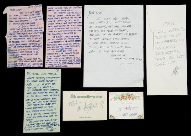 As the song tells us, nothing lasts forever, and when Axl Rose is involved, that impermanence is likely to be highlighted with legal documents and high-wattage drama. And now, in November no less, Axl's ex-wife, Erin Everly, is drenching the GN'R singer in some metaphorical cold rain -- and making it rain for herself! -- by auctioning off a small museum's worth of ultra-personal effects obtained during their five-year relationship.