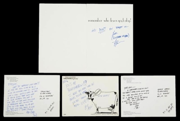 Presumably somebody is going to buy this stuff, but most of it seems both too depressing and too fucking unnecessary to be worth any sane person's hard-earned cash. Seriously, what are you gonna do with the paperback copy of Richard Bach's The Bridge Across Forever given to Everly by Rose? High-concept gag gift? That's pretty sick shit, man. And yet there are three bids on the thing right now. Considering their reportedly abusive relationship, I can't fault Everly for trying to cash in, I guess. But in 2013, who cares enough about the domestic life of Axl Rose to pay hundreds of dollars for a drawer full of his "personal items," comprising "a Mickey Mouse Lorus watch; a lanyard with multiple keys, a pocket knife and Ripley's Believe it or Not token; a loose key that appears to be from a hotel room; a Troubadour 1984 button; a novelty 'Pam Pam' toy gun; a Garfield 'I love Oakland School' button; an additional lanyard; and a metal whistle"? Nobody, right? Wrong: somebody. That lot has two bids on it with 15 days to go. Yeah, ain't my money, I know. Anyway check out some of the more random crap for sale in the gallery above.