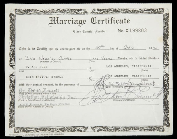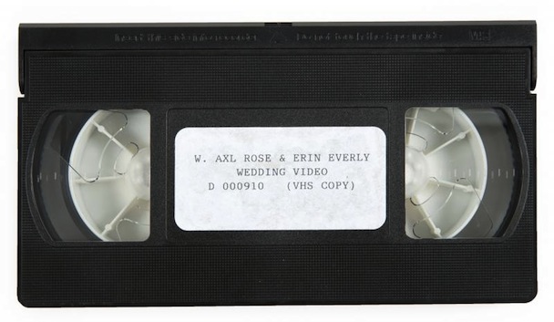 Online bids are being taken now at Julien's Auctions for items ranging from the couple's wedding video to the domestic abuse report filed by Everly against Rose. There's also some candid photos, random detritus (a hospital bracelet?), and some legit Hard Rock Cafe-worthy memorabilia such as a pair of leather-crotched jeans owned by Rose and the shirt he wore in the "Welcome To The Jungle Video." Rose and Everly were together in some capacity from 1986 to 1991 -- i.e., the best years of Rose's life, artistically speaking -- so for most of us, this sad motherlode merely serves as a biography of a deeply troubled relationship, as well as a reminder of Rose's inner turmoil and long fallow period as a musician.