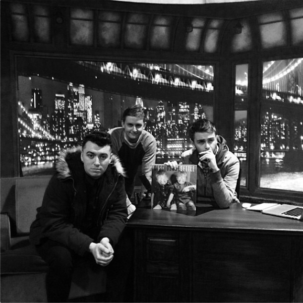 Last night, the groups behind two of last year's best albums showed up on American late-night TV. First, there was Vampire Weekend on Kimmel. Then, there was the two Lawrence brothers of Disclosure, whose LP Settle persistently refuses to get old, making their U.S. TV debut on Late Night With Jimmy Fallon. The duo brought singer Sam Smith along for a rendition of their breakout single "Latch," and they also had a setup where their face-logo thing, projected on a wall behind them, sings along -- not something they had the last time I saw them live. It looked weird! Watch the performance below.