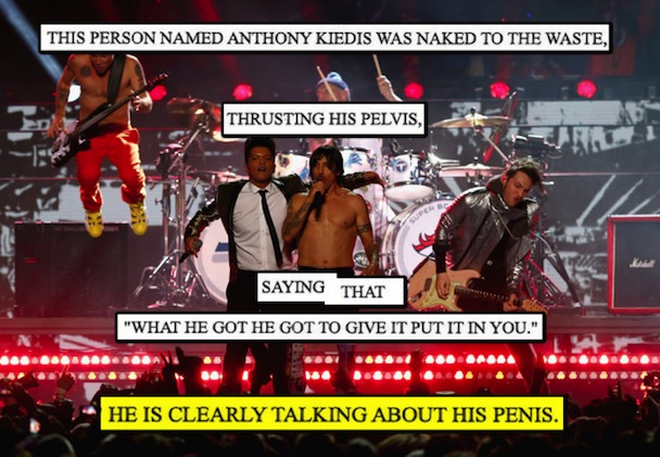 While we all remember a lot of unhappy viewers reporting to the FCC during M.I.A.'s Superbowl performance a few years back. Now many complaints about the Red Hot Chili Peppers' performance have surfaced as a way to prove that people will find a way to get offended by anything. The issues range from being disgusted by Anthony Kiedis to being angry that David Beckham appeared in his underwear in a commercial. The one above might be the crème de la crème, but you can read more below.