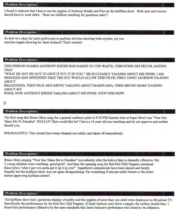 Head to Deadspin (who file a FOIA each year to obtain these often funny complaints) to see them all. Not a single complaint is about the fact that their instruments were not plugged in.