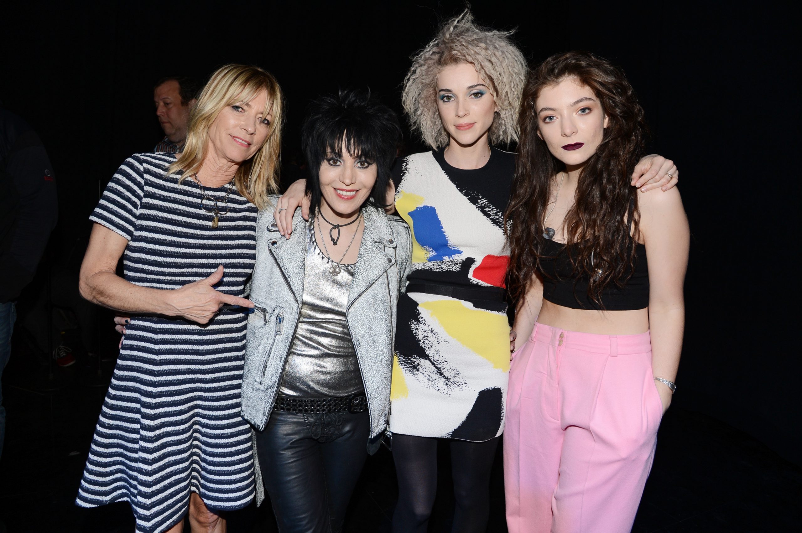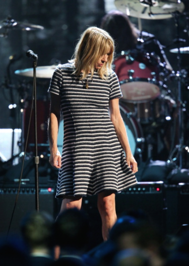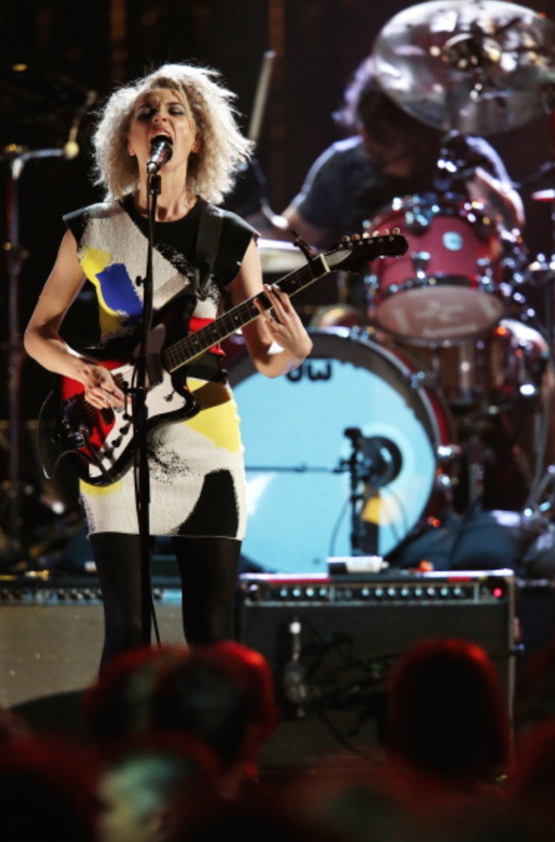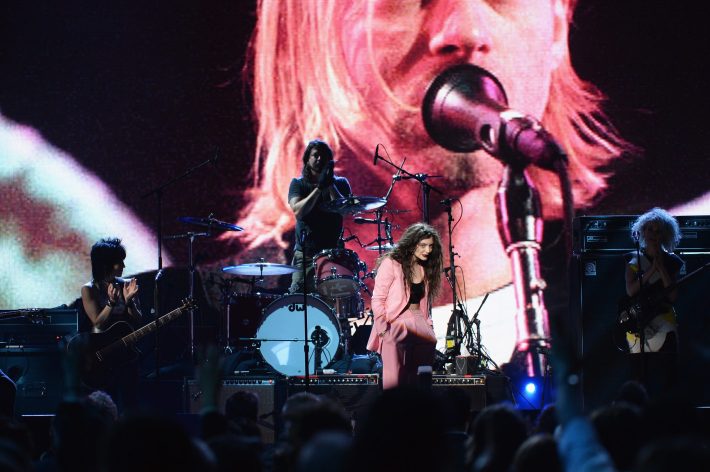 So the 2014 Rock & Roll Hall Of Fame Induction Ceremony happened at Brooklyn's Barclays Center, and this year, it's relevant to your interests! As you might have heard, Nirvana were inducted by R.E.M.'s Michael Stipe ("They were singular and loud and melodic and deeply original," he said of the band), and after much consternation and subtle hints delivered via social media, a Frankenstein version of the band did indeed perform, with Dave Grohl behind the drum kit, Krist Novoselic on bass, Pat Smear on guitar, and Joan Jett standing in for the late Kurt Cobain, playing "Smells Like Teen Spirit." Jett was followed by Kim Gordon for "Aneurysm." Then, St. Vincent's Annie Clark on "Lithium." And finally, Lorde joined the band for a rendition of "All Apologies."