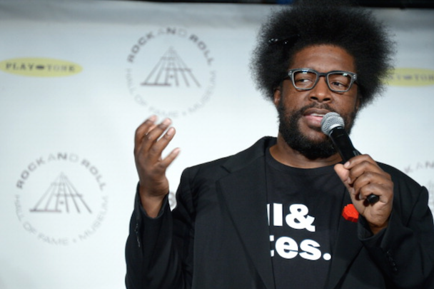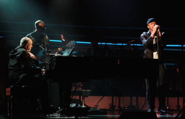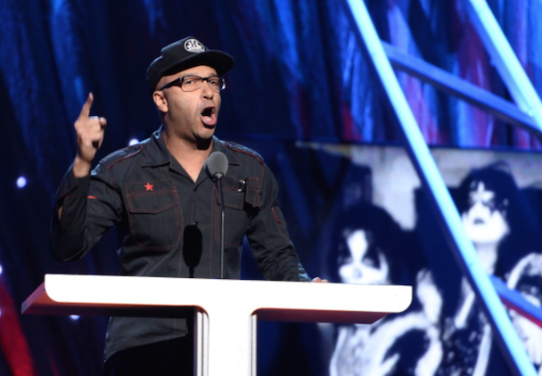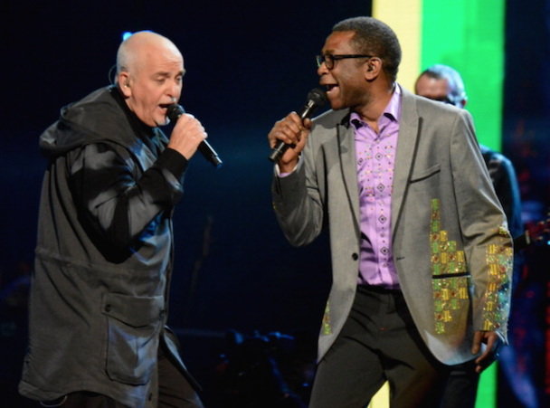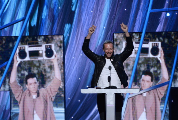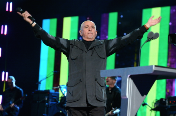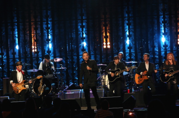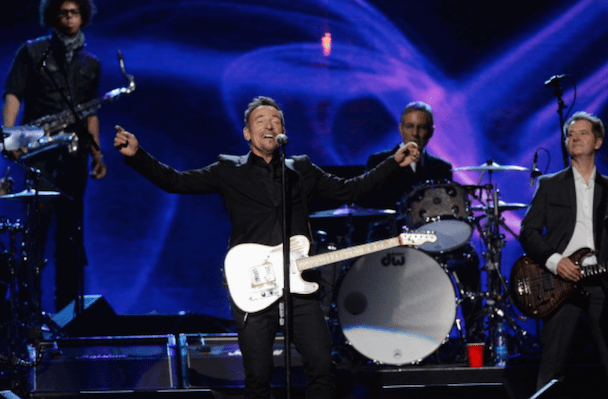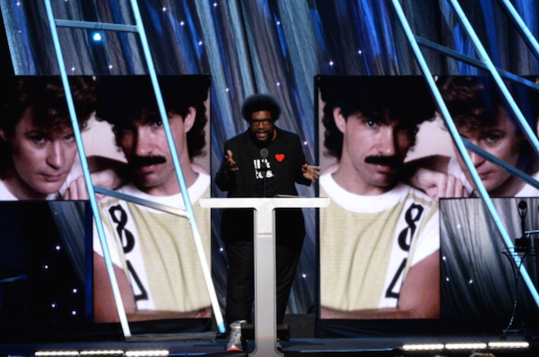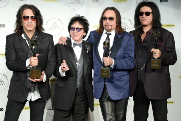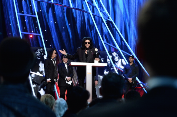 It wasn't just Nirvana though! Also, on the night's docket was Peter Gabriel's induction by Chris Martin, who read funny quotes about Phil Collins from "the book of Genesis." "He's a curator and an inspirer and he helped John Cusack get his girlfriend back in Say Anything," the Coldplay frontman added. Gabriel (already an inductee with Genesis) performed "Digging In The Dirt," "Washing Of The Water" (with Martin, who said it was his favorite Gabriel song), and "In Your Eyes" with Youssou N'Dour. After an intro by Tom Morello, KISS' Paul Stanley, Gene Simmons, Ace Frehley, and Peter Criss took the stage (sans makeup) to accept their award, and said nice words about one another, but did not perform. Art Garfunkel inducted Yusuf Islam (bka Cat Sevens), who told the crowd "I never thought I'd be on the same stage as KISS" and performed some of his hits including "Wild World." Glenn Frey inducted Linda Ronstadt, who did not attend (her Parkinson's disease makes travel difficult) so Carrie Underwood, Stevie Nicks, Emmylou Harris, Bonnie Raitt, and Sheryl Crow sang in her honor. Bruce Springsteen toasted the E Street Band, whose members took up a lot of time with their speeches, setting the event well behind schedule. They performed "E-Street Shuffle," "The River," and "Kitty's Back." Questlove inducted Hall & Oates, who performed "She's Gone" (after an aborted first attempt due to difficulties with their monitors), "I Can't Go For That (No Can Do)," and "You Make My Dreams Come True." Said Questo in his speech, "Oates cowrote most of [their best] songs. Not to mention going onto a second career producing Howard Stern. Baba Booey."