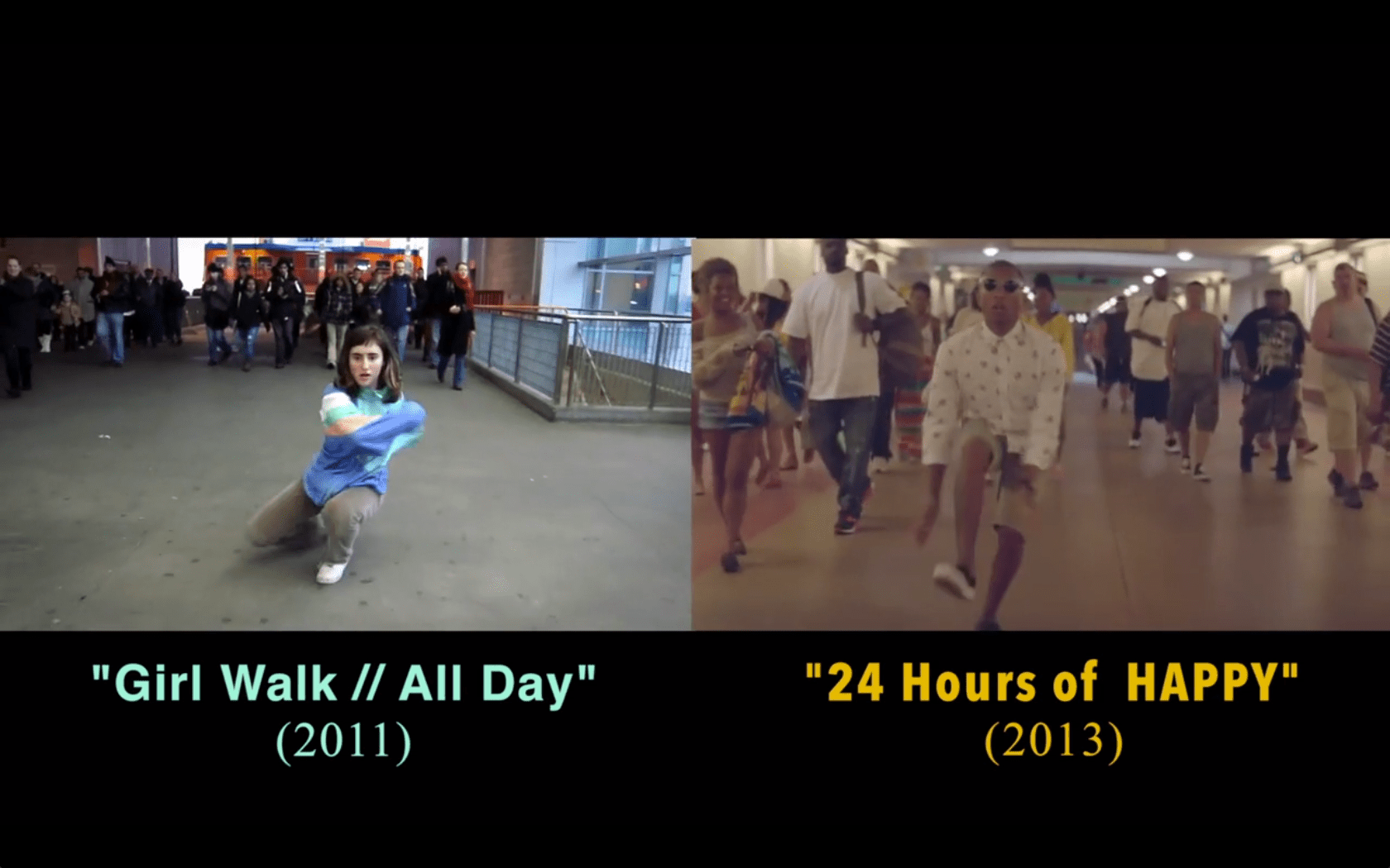 Last year, well before "Happy" became the inescapable 10-week reigning #1 single it is today, Pharrell released a star-studded, globetrotting 24-hour music video for the song. It inspired more than 1,000 remakes and became the kind of viral sensation that everybody saw. That included Anne Marsen, a 24-year-old Brooklyn actress and dancer who couldn't help but notice some striking similarities between "24 Hours Of 'Happy'" and Girl Walk // All Day, a 71-minute film she made in 2011 in which she dances in locations around New York City to the sounds of Girl Talk's mashup album All Day. So she made this video to point out the resemblance.