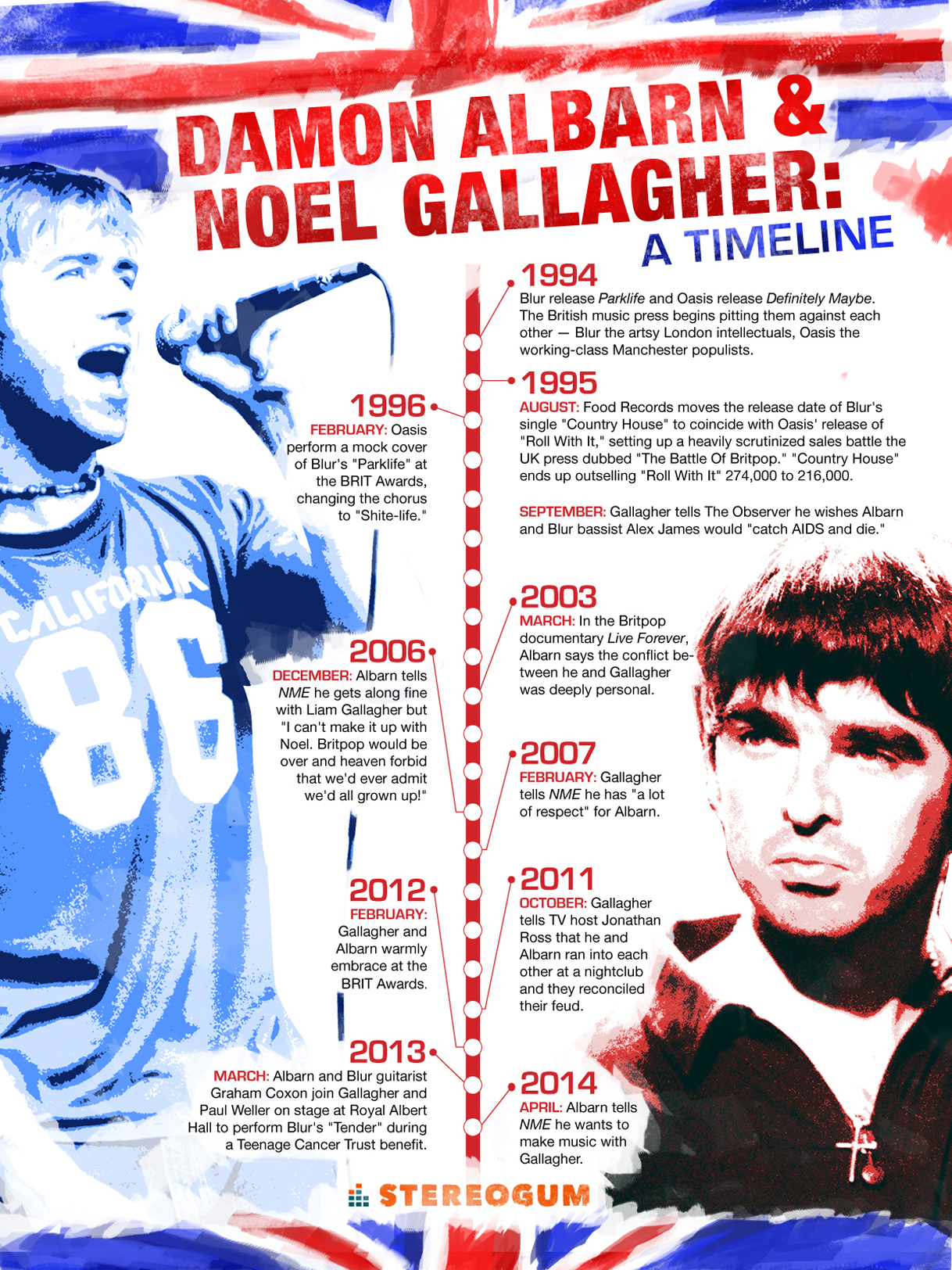 As resident anglophile Michael Nelson explained in his tremendous introduction to Britpop Week, the era's feuds are almost as essential to Britpop history as the music. And no conflict defined the Britpop era more than the rivalry between Blur and Oasis -- more specifically, the war of egos between the bands' primary songwriters, Blur's Damon Albarn and Oasis' Noel Gallagher. The dueling geniuses have since gone from bitter enemies to such jolly old pals that they're talking about collaborating on music, but Britpop's royals had to endure a wildly entertaining yet disconcertingly bilious media-abetted war on the way to a united kingdom. Here are 10 notable moments in that progression from adversaries to chums.