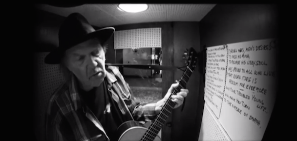 Last week Neil Young released the vinyl-only A Letter Home, a collection of covers recorded in single takes on acoustic guitar in Jack White's Voice-O-Graph booth at Third Man Records. About the size of a phone booth, the machine records you to vinyl as you play, which is exactly what Young did, giving the album a unique vintage quality. It became a surprise release on Record Store Day via Third Man, but now Reprise will issue a deluxe version of the album, which contains a CD, standard LP, "audiophile" LP, seven 6" vinyl singles, picture book, and a DVD of videos of Young recording the various covers, which include songs by Bruce Springsteen, Bob Dylan, and Willie Nelson. Below you can watch a video of Young playing Bert Jansch's "Needle Of Death."