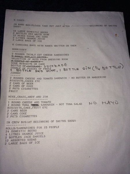 When the Smiths were touring behind The Queen Is Dead in 1986, they were fueled largely by cheese sandwiches and booze. (Also, some of them ate tuna, which seems at least a little bit murderous.) So explains the US tour rider that appeared on Twitter yesterday. Check out all the exceedingly reasonable requests below.