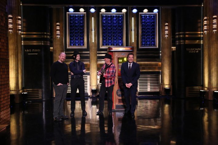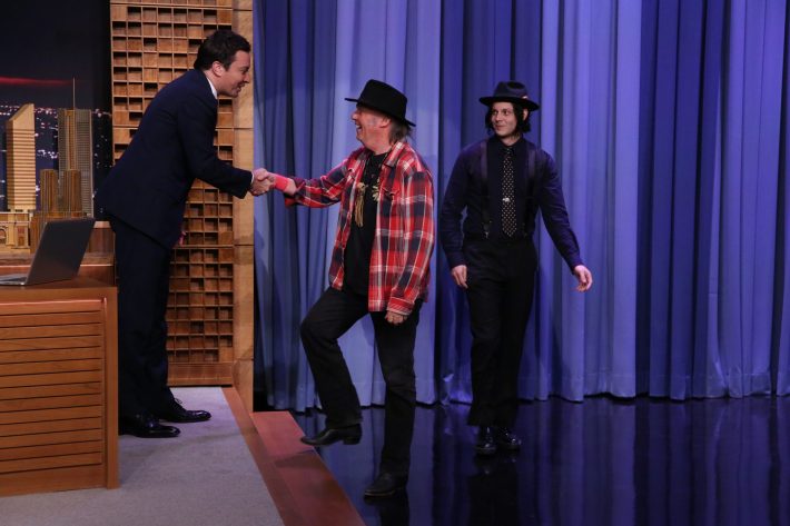 Last month, Neil Young released A Letter Home, an album of old-timey covers recorded entirely in the straight-to-vinyl Voice-O-Graph booth at Jack White's Third Man compound. And last night, Young and White found an interesting way to subvert the whole musical-guest thing when they appeared on The Tonight Show. They brought the booth to Jimmy Fallon's New York studio, using it to cut a record right there onstage. On the broadcast, in his first performance on a Fallon show (not counting the younger Young impressions), Young did a solo-acoustic version of "Crazy," the classic Willie Nelson song most famously sung by Patsy Cline. And as an online bonus, he also sat at a piano to do a version of Ivory Joe Hunter's "Since I Met You Baby." Watch both performances and their interview, featuring a cameo from guest Louis C.K., below.