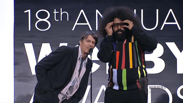 Last night brought the 18th Annual Webby Awards, where Ylvis' captivatingly bizarre video for "What The Fox Say?" won for Best Viral Video. Appearing to hand off the award were Stephen Malkmus and Reggie Watts, who both appeared to have trouble reading the teleprompter, which led to the already stiff dialogue taking on a hilariously stilted awkwardness. Whether this was part of the bit or just a mistake isn't clear, but it's great. In addition to Malkmus, there were also appearances from Fred Armisen (as Ian Rubbish), Questlove presenting De La Soul with the Artist Of The Year award, and Patti Smith awarding Banksy the Person Of The Year award. Watch footage of all those things below.