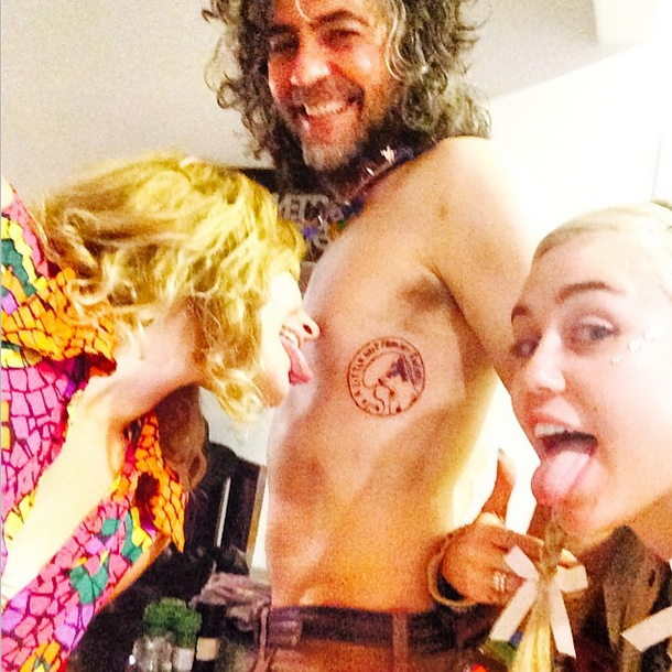 The Wayne Coyne and Miley Cyrus party train rolled on Saturday in the form of matching tattoos. Specifically, at a house party in Los Angeles, the controversial Flaming Lips frontman and the also-controversial pop superstar (as well as Coyne's girlfriend, Katy Weaver) got matching chest tats of Cyrus' dead dog Floyd along with the saying, "With A Little Help From My Fwends." The whole ordeal not nearly as discomfiting as this photo, so that's something, I guess. As previously reported, the Flaming Lips will be heavily involved on the next Cyrus album. Check out the photo evidence of the tattoo party below, and watch Coyne and Cyrus performing together for the Billboard Music Awards here.