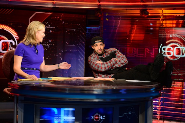Drake is hosting ESPN's annual sports awards show, the ESPYS, on Wednesday night, and he gave a teleconference about it this afternoon. During the 20-minute call, Drake said he'll be doing more celebrity impressions after doing some killer impersonations on SNL earlier this year. He also said he would be performing music during Wednesday's broadcast ("0 To 100," pretty please) and that the production team has assembled "some incredible pre-tapes." It was a cordial and lighthearted call for the most part, with Drake promising "a treat" for those hoping he'll reference his much-publicized crush on WNBA star Skylar Diggins, explaining that "despite what everyone on the Internet thinks" he's not a bandwagon jumper (he just supports individual players rather than teams for the most part), and even politely chuckling at one reporter's lint-roller joke. ("That's funny," he deadpanned.) But things took a slightly tenser turn near the end when Drake continued his history of tennis-related beef.