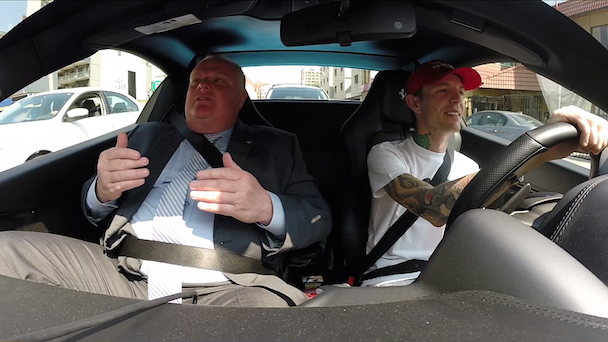 Last month, Rob Ford made his return to office as the mayor of Toronto after a stint in rehab and after losing many of his actual mayoral powers in the midst of a crack-cocaine scandal. But in the latest episode of the series Coffee Run, Ford spends some time with Deadmau5 in the superstar DJ's Nyan Cat Ferrari (the "Purrari"). While you might jump in to the video expecting discussions about drugs, or how much Arcade Fire suck, it's a very mellow 30 minutes. The two mostly talk about cars, traffic, and coffee, as they make their way to Tim Hortons where Deadmau5 gets an extra-large double-double (the internet tells me this is Canadian for "two sugars, two creams") and Ford orders "five expressos [sic] in one cup." Watch it below.