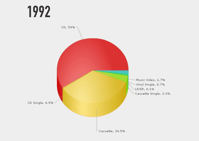 Everybody knows the music industry has undergone monumental change in the past 30 years. How much change? This handy GIF from Digital Music News, which breaks down revenue according to medium (adjusted for inflation) will show you.