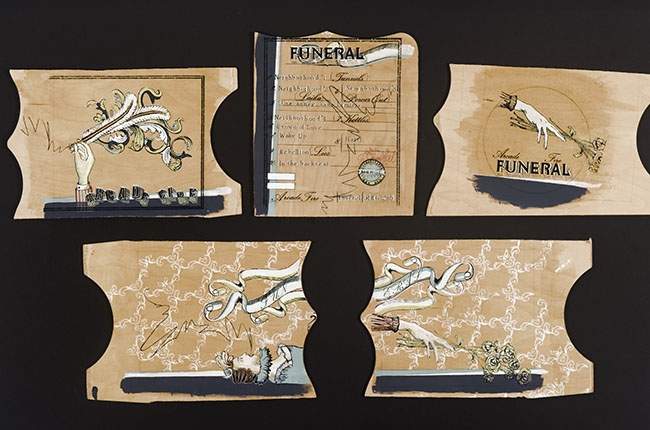 Along with some then-unreleased Arcade Fire tracks, the band shared "a few reference images and some old birth and death certificates" to communicate its prevailing themes: childhood, death, and reflection of the past and future. Both [Win] Butler and [Regine] Chassagne had lost grandparents during the recording process, so Maurice had been trusted with a project that came from a deeply personal space. Even so, the artist's own articles -- photographs, musicsheets, prayer cards, valentines, and illustrated books from the early 1990s -- fit the theme and inspired the final product, which she painted onto the pieces of a wooden planter.