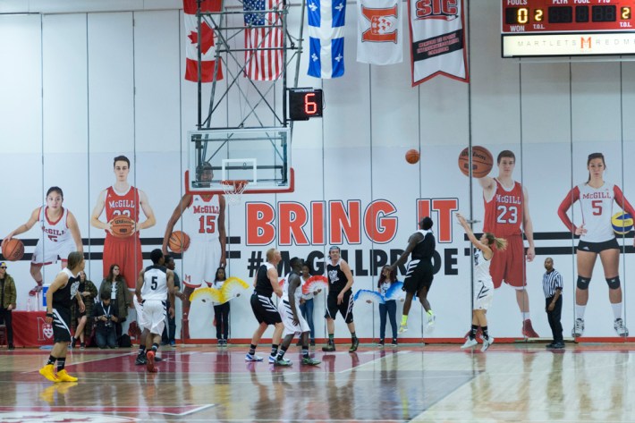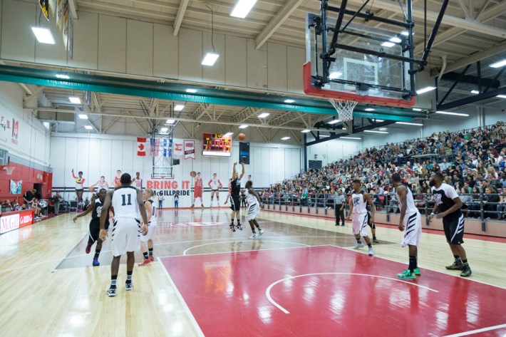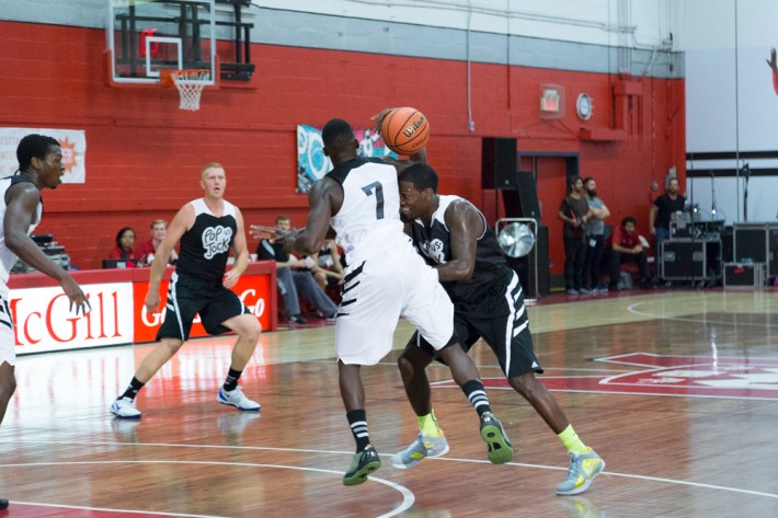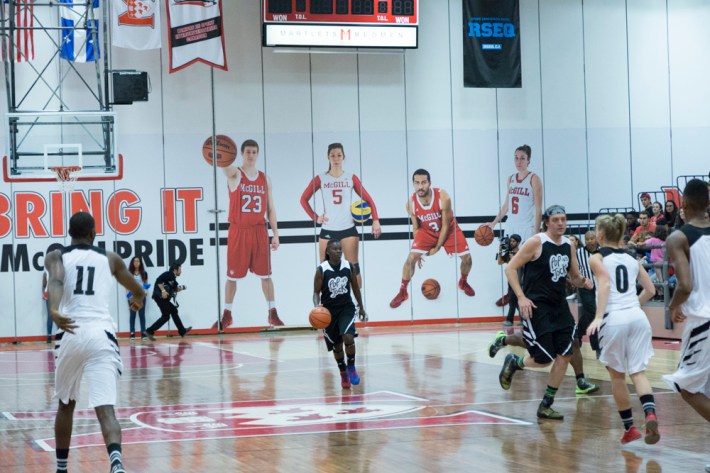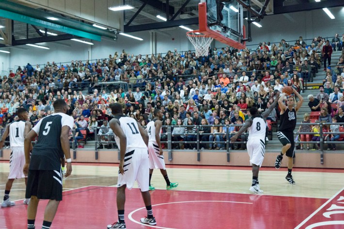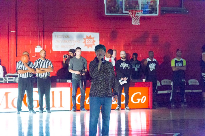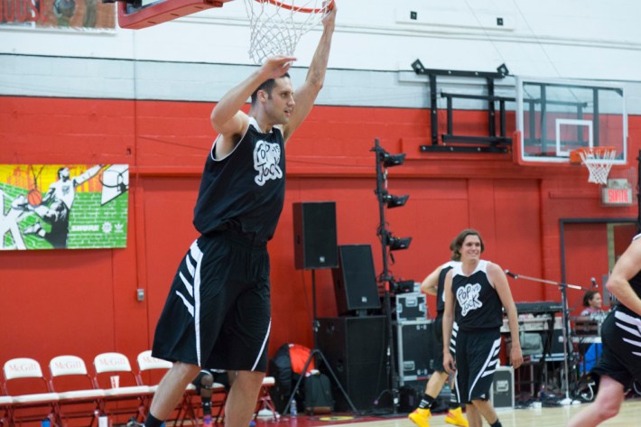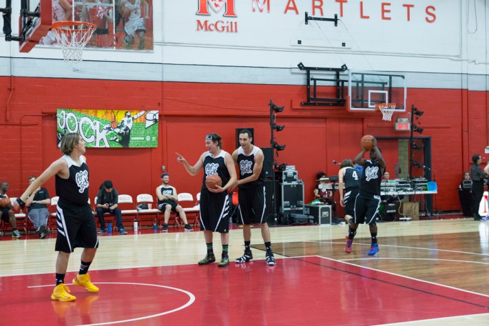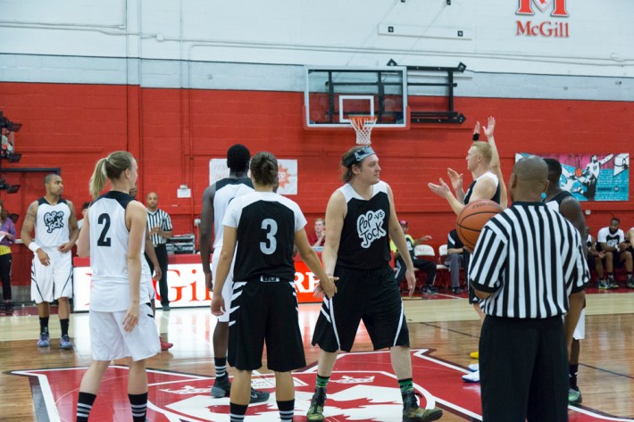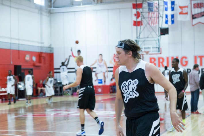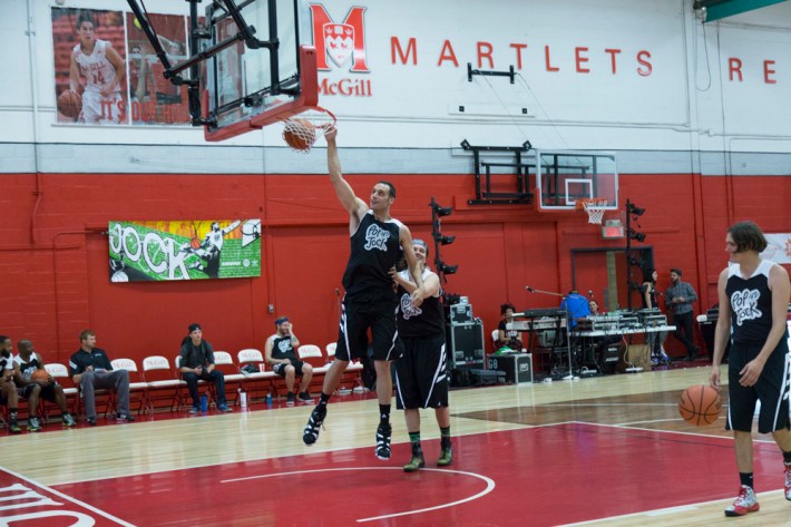 Who says indie rockers can't dominate on the basketball court? At yesterday's POP vs. Jock basketball game, played for the third year in a row at the POP Montreal festival, Arcade Fire's Win Butler and a group of musicians including his bandmate and brother Will, Bon Iver's Justin Vernon, and Nikolai Fraiture of The Strokes showed they could give college-level players a run for their money. They took on team Jock, which boasted members of the McGill and Concordia University basketball teams. After a slow start in the first quarter, POP dominated later in the game and came back to win 101-92.