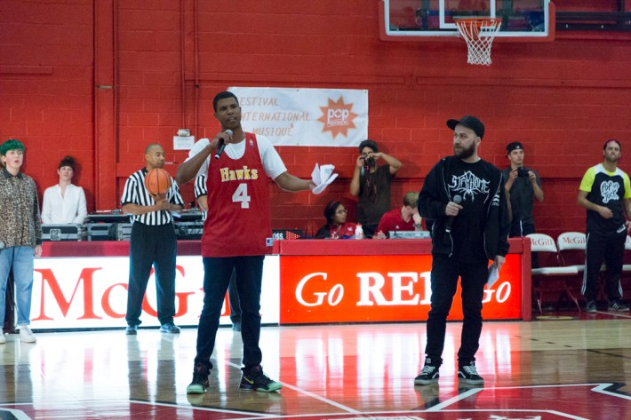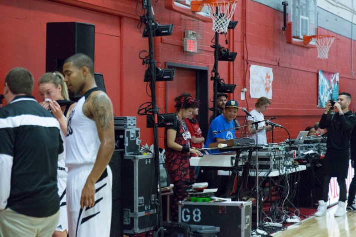 Anticipation ran high for the halftime show as attendees wondered what this all-star group of artists would cook up. Things got started with Kid Koala leading a parade of kids dressed in animal costumes and playing kazoos around the gym, and then he invited volunteers from the audience to participate in a kazoo battle. Next, A-Trak and Chassagne led a round of live karaoke, with Luke Bonner singing Alanis Morisette's "You Oughta Know" after losing a three-point shooting competition to his brother Matt.